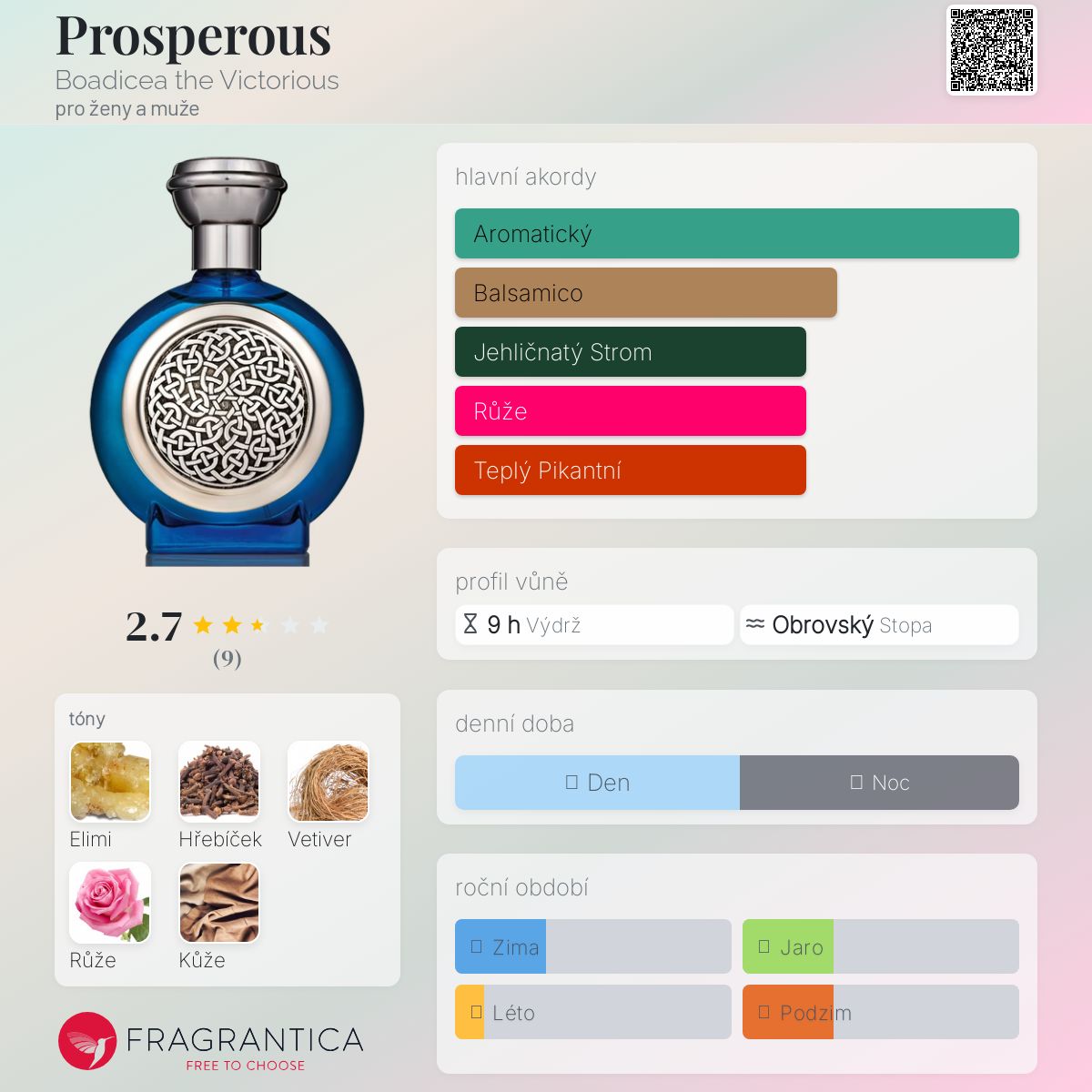 Prosperous podle Boadicea the Victorious je vůně pro ženy a muže. Prosperous byl/a uveden/a v roce 2020. Vrchní tóny jsou Pryskyřice elimi a Hřebíček; střední tóny jsouVetiver a Růže ; základní tón je Kůže.