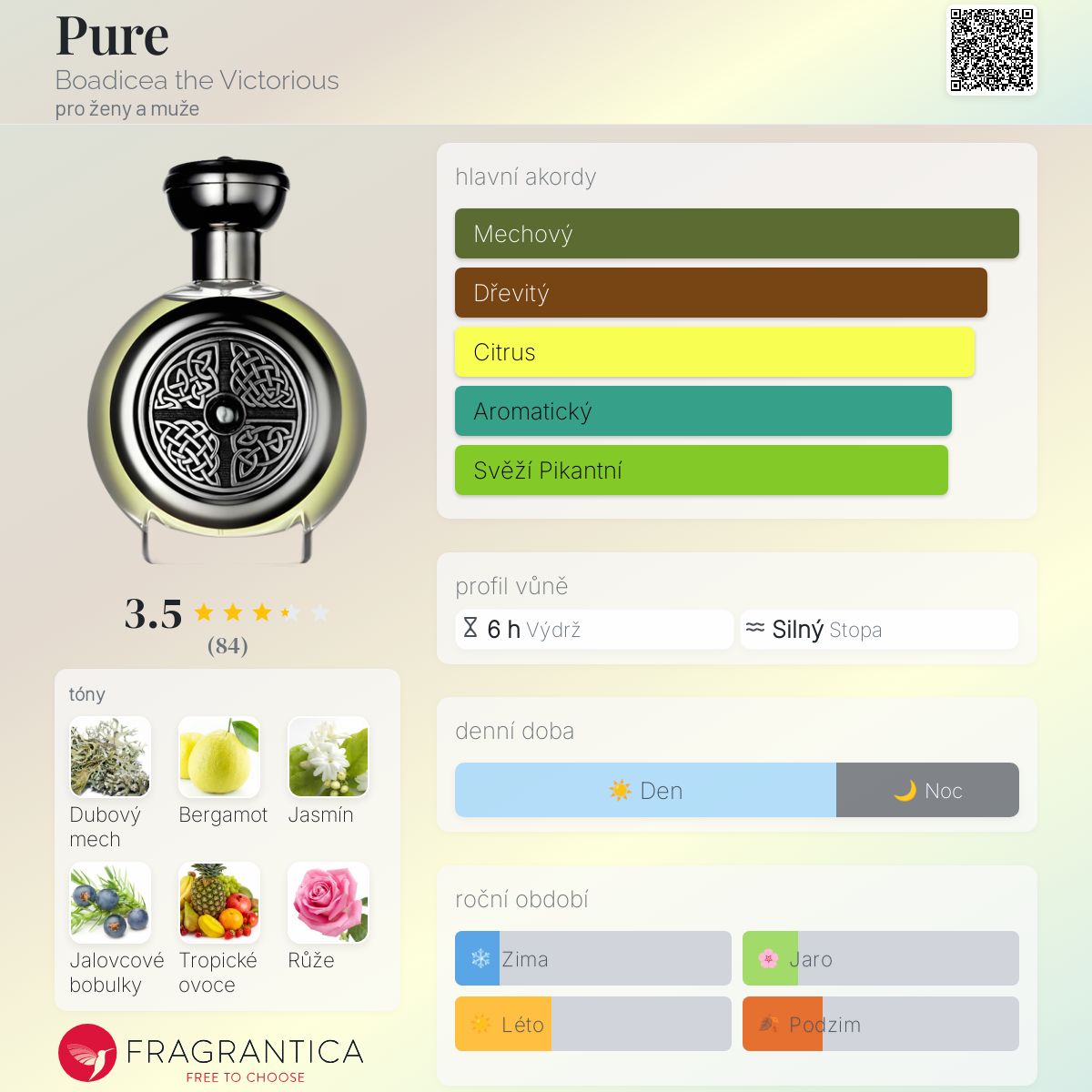 Pure podle Boadicea the Victorious je Chypre Floral vůně pro ženy a muže. Pure byl/a uveden/a v roce 2008. "Nosem" za touto vůní je John Stephen. Vrchní tóny jsou Bergamot a Tropické ovoce; střední tóny jsouJasmín, Jalovcové bobulky a Tinktura z růže ; základní tóny jsou Dubový mech, Santalové dřevo a Jantar (ambra).