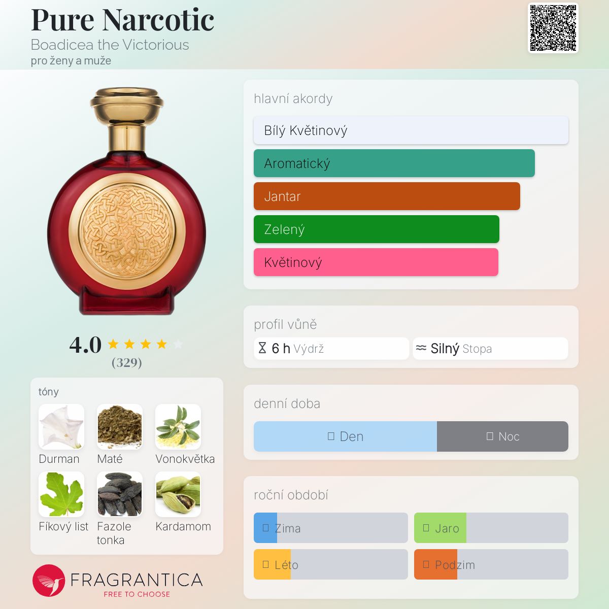 Pure Narcotic podle Boadicea the Victorious je Floral Woody Musk vůně pro ženy a muže. Pure Narcotic byl/a uveden/a v roce 2015. "Nosem" za touto vůní je Christian Provenzano. Vrchní tóny jsou Durman, Fíkový list, Kardamom, Bergamot a Koriandr; střední tóny jsouMaté, Vonokvětka, Jasmín a Marocká růže ; základní tóny jsou Fazole tonka, Benzoin, Jantar (ambra), Santalové dřevo, Bourbonská vanilka a Pižmo.