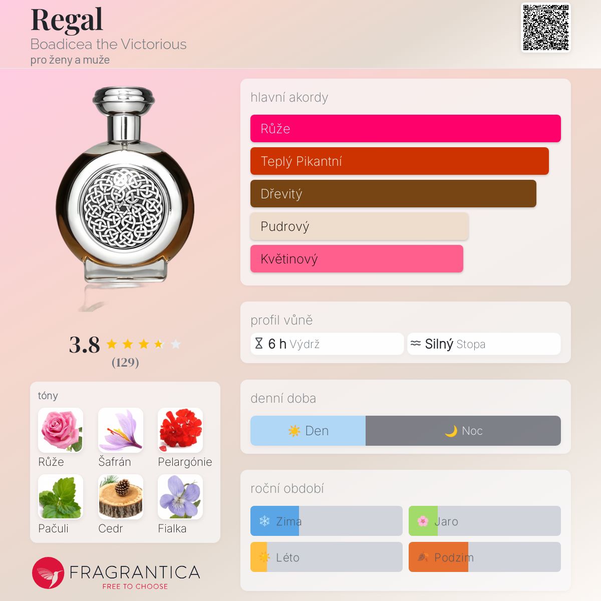 Regal podle Boadicea the Victorious je Orientální vůně pro ženy a muže. Regal byl/a uveden/a v roce 2010. "Nosem" za touto vůní je Christian Provenzano. Vrchní tóny jsou Šafrán, Pelargónie a Zelené tóny; střední tóny jsouRůže, Fialka, Hedione a Jasmín ; základní tóny jsou Pačuli, Virginský cedr, Santalové dřevo, Jantar (ambra) a Pižmo.
