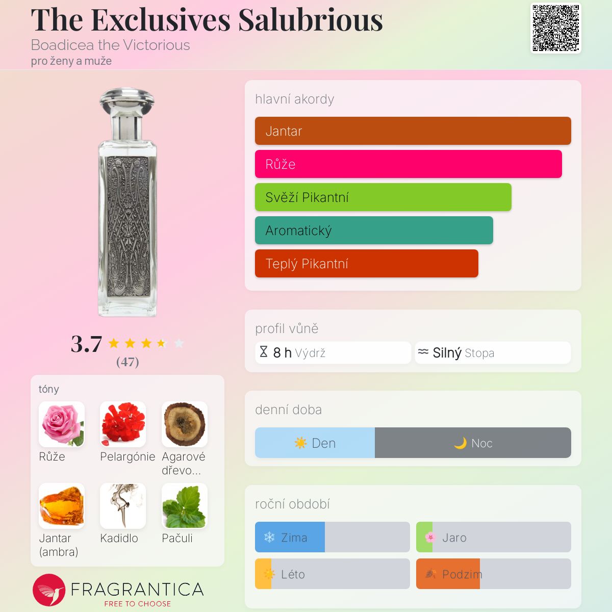 The Exclusives Salubrious podle Boadicea the Victorious je Orientální Floral vůně pro ženy a muže. Vrchní tóny jsou Marocká růže, Pelargónie a Pomerančový květ; střední tóny jsouJantar (ambra) a Olibanum ; základní tóny jsou Agarové dřevo (oud), Kadidlo, Pačuli, Vetiver, Pižmo a Fazole tonka.