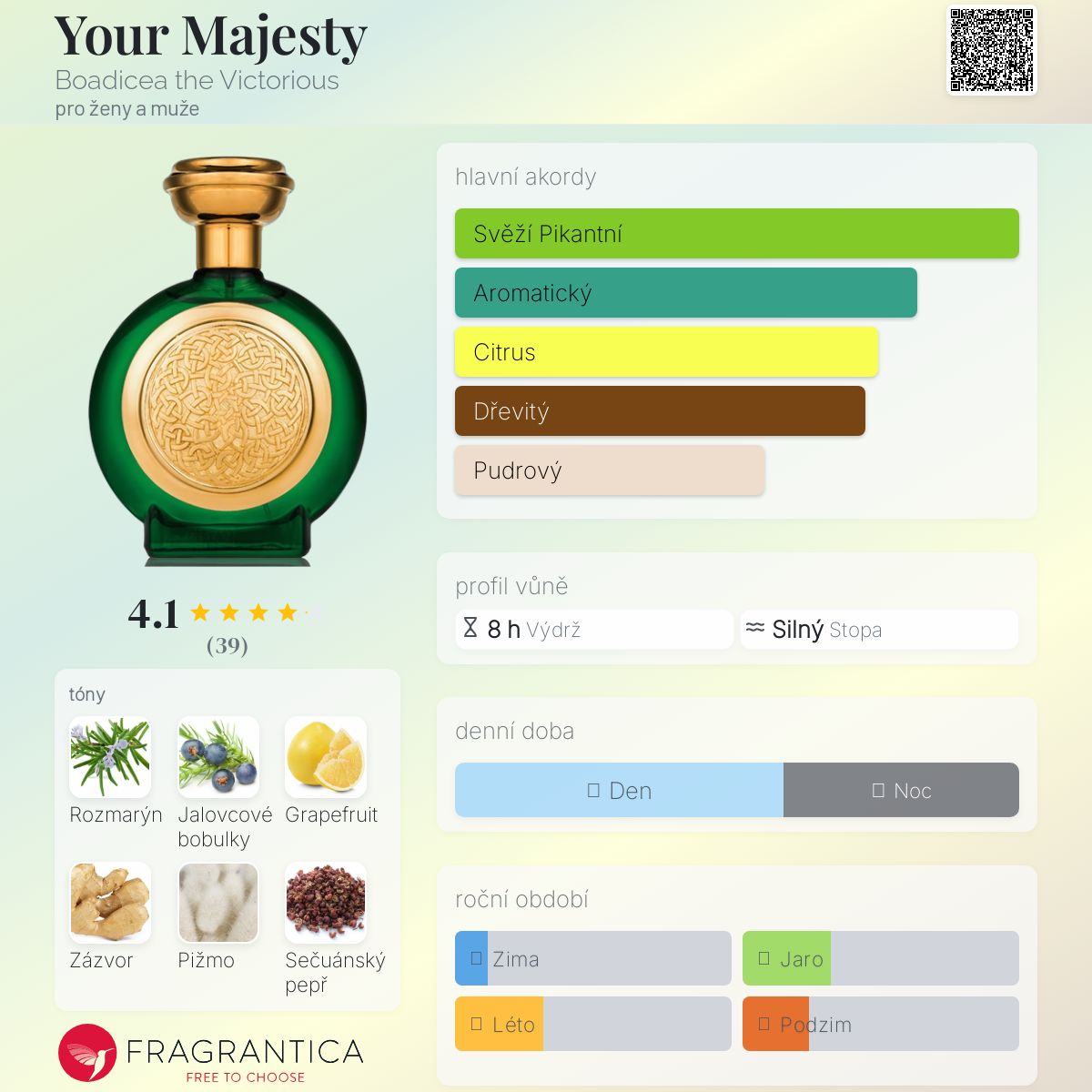 Your Majesty podle Boadicea the Victorious je vůně pro ženy a muže. Vrchní tóny jsou Jalovcové bobulky, Grapefruit, Zázvor a Bergamot; střední tóny jsouRozmarýn a Sečuánský pepř ; základní tóny jsou Pižmo, Dubový mech, Santalové dřevo a Jantar (ambra).