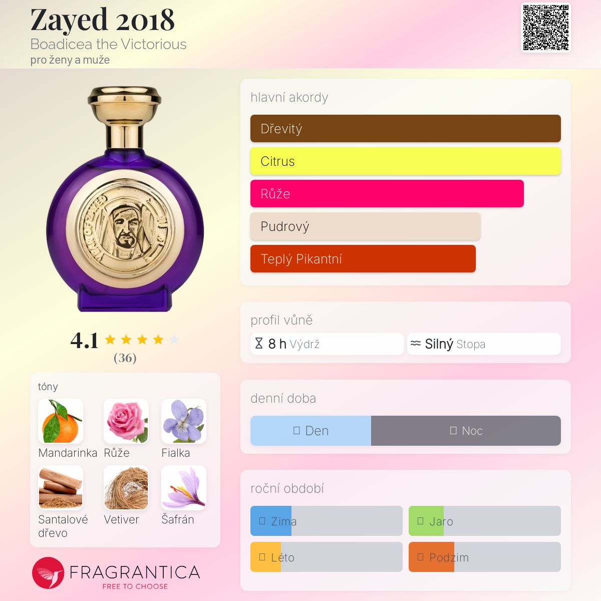 Zayed 2018 podle Boadicea the Victorious je Floral vůně pro ženy a muže. Zayed 2018 byl/a uveden/a v roce 2018. Vrchní tóny jsou Mandarinka, Šafrán a Bergamot; střední tóny jsouTurecká růže, Fialka a Hedione ; základní tóny jsou Santalové dřevo, Vetiver, Pačuli, Mech a Jantar (ambra).