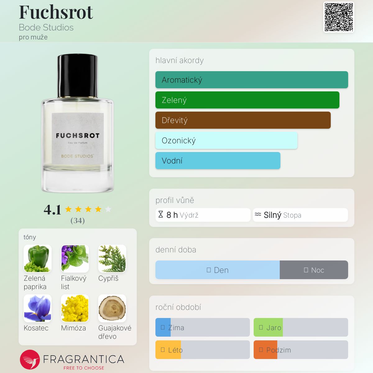 Fuchsrot podle Bode Studios je vůně pro muže. Fuchsrot byl/a uveden/a v roce 2022. "Nosem" za touto vůní je Andreas Wilhelm. Vrchní tóny jsou Zelená paprika, Fialkový list, Citrón a Koňak; střední tóny jsouFialkový list, Cypřiš, Kosatec a Mimóza ; základní tóny jsou Guajakové dřevo, Vetiver, Fazole tonka a Kůže.