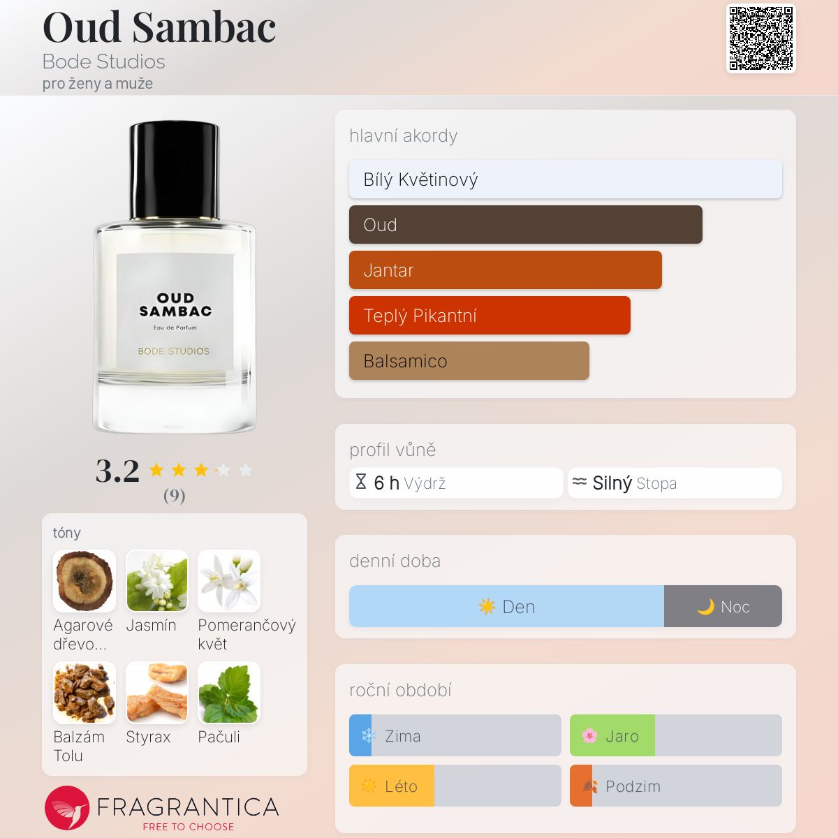 Oud Sambac podle Bode Studios je Orientální Woody vůně pro ženy a muže. Toto je nová vůně. Oud Sambac byl/a uveden/a v roce 2025. "Nosem" za touto vůní je Andreas Wilhelm. Vrchní tóny jsou Pomerančový květ, Cejlonská skořice, Bílé květy a Bergamot; střední tóny jsouJasmín Sambac, Balzám Tolu, Styrax a Vanilka ; základní tóny jsou Agarové dřevo (oud), Pačuli, Kůže a Cedr.