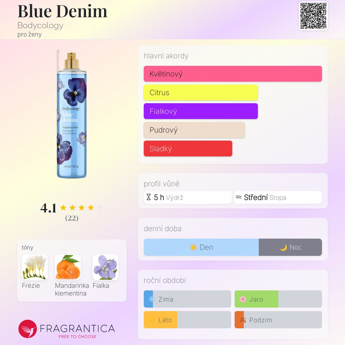Blue Denim podle Bodycology je Floral Fruity vůně pro ženy. Toto je nová vůně. Blue Denim byl/a uveden/a v roce 2024.