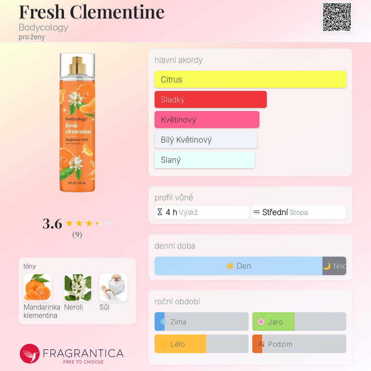 Fresh Clementine podle Bodycology je Citrus vůně pro ženy. Toto je nová vůně. Fresh Clementine byl/a uveden/a v roce 2025. Vrchní tón je Mandarinka klementina ; střední tón jeNeroli ; základní tón je Mořská sůl.