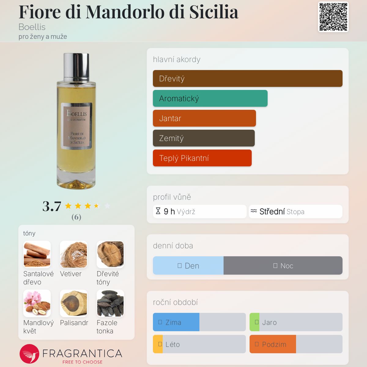 Fiore di Mandorlo di Sicilia podle Boellis je Orientální Woody vůně pro ženy a muže. Fiore di Mandorlo di Sicilia byl/a uveden/a v roce 2018. Vrchní tóny jsou Mandlový květ a Palisandr; střední tóny jsouSantalové dřevo, Vetiver a Dřevité tóny ; základní tóny jsou Fazole tonka, Ambra a Vanilka.