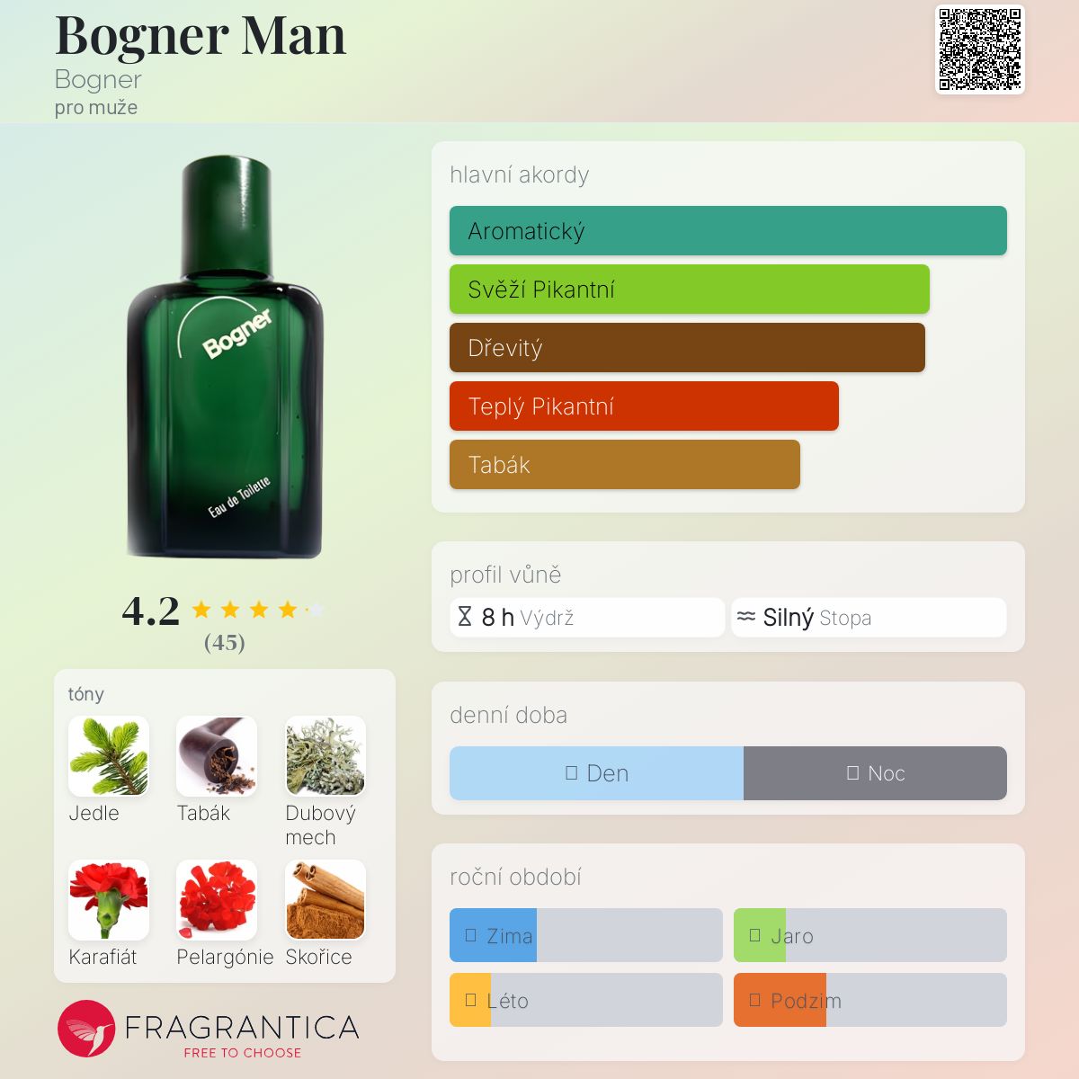 Bogner Man podle Bogner je Woody Chypre vůně pro muže. Bogner Man byl/a uveden/a v roce 1985. "Nosem" za touto vůní je Dirk Lauven. Vrchní tóny jsou Galbanum, Rozmarýn, Pelyněk a Citrón; střední tóny jsouKarafiát, Pelargónie a Skořice ; základní tóny jsou Jedle, Tabák, Dubový mech a Cedr.