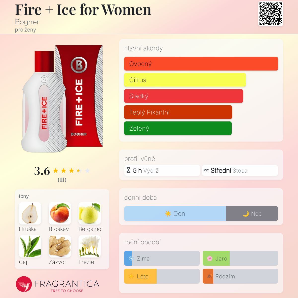 Fire + Ice for Women podle Bogner je Floral Fruity vůně pro ženy. Fire + Ice for Women byl/a uveden/a v roce 2011. Vrchní tóny jsou Hruška, Bergamot, Čaj a Kardamom; střední tóny jsouBroskev, Zázvor, Frézie a Jasmín ; základní tóny jsou Vanilka, Pižmo, Santalové dřevo a Jantar (ambra).