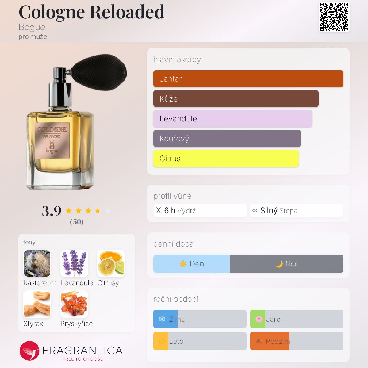 Cologne Reloaded podle Bogue je Woody Chypre vůně pro muže. Cologne Reloaded byl/a uveden/a v roce 2013. "Nosem" za touto vůní je Antonio Gardoni. Vrchní tóny jsou Levandule a Citrusy; střední tóny jsouStyrax a Pryskyřice ; základní tón je Kastoreum.