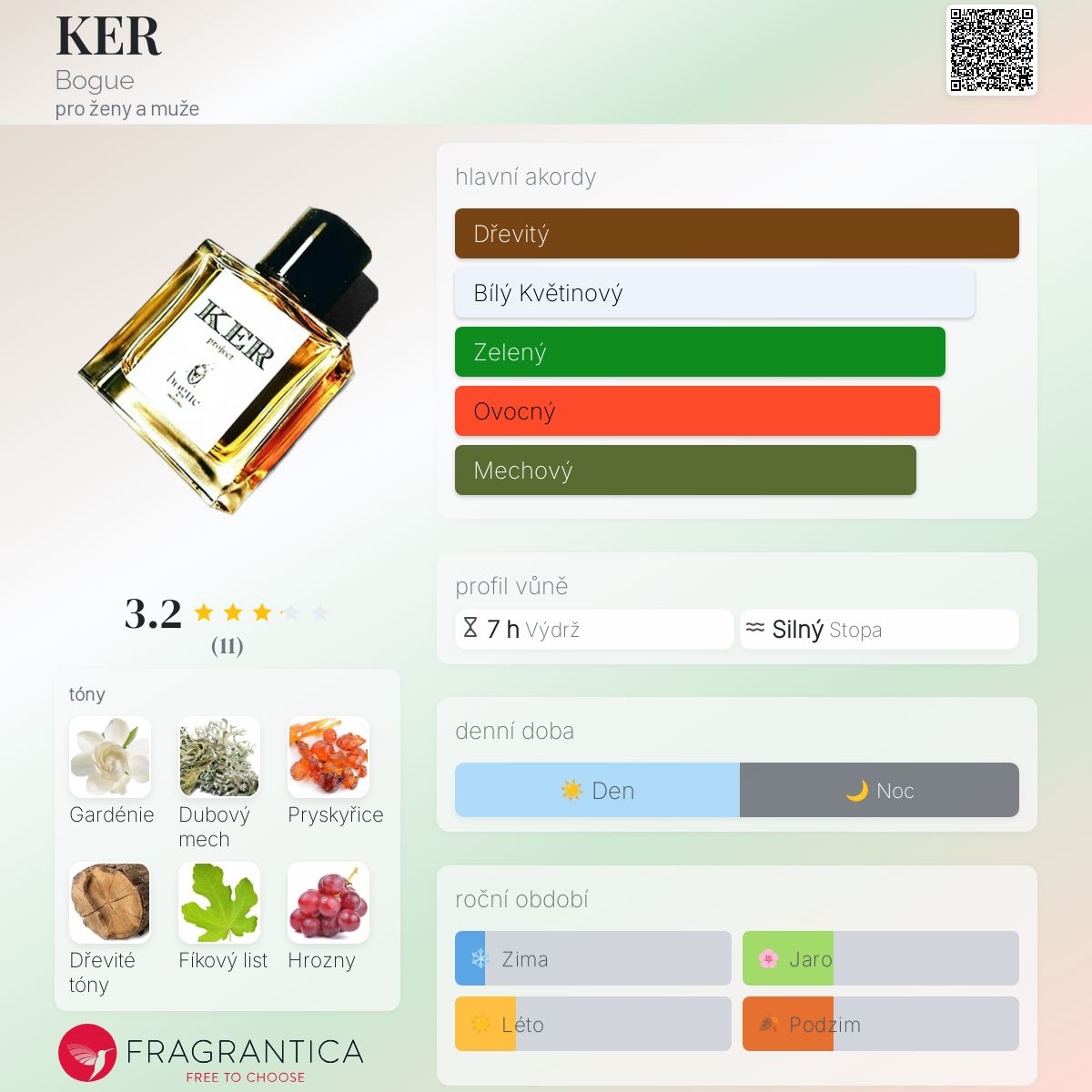 KER podle Bogue je Orientální Woody vůně pro ženy a muže. KER byl/a uveden/a v roce 2014. "Nosem" za touto vůní je Antonio Gardoni.