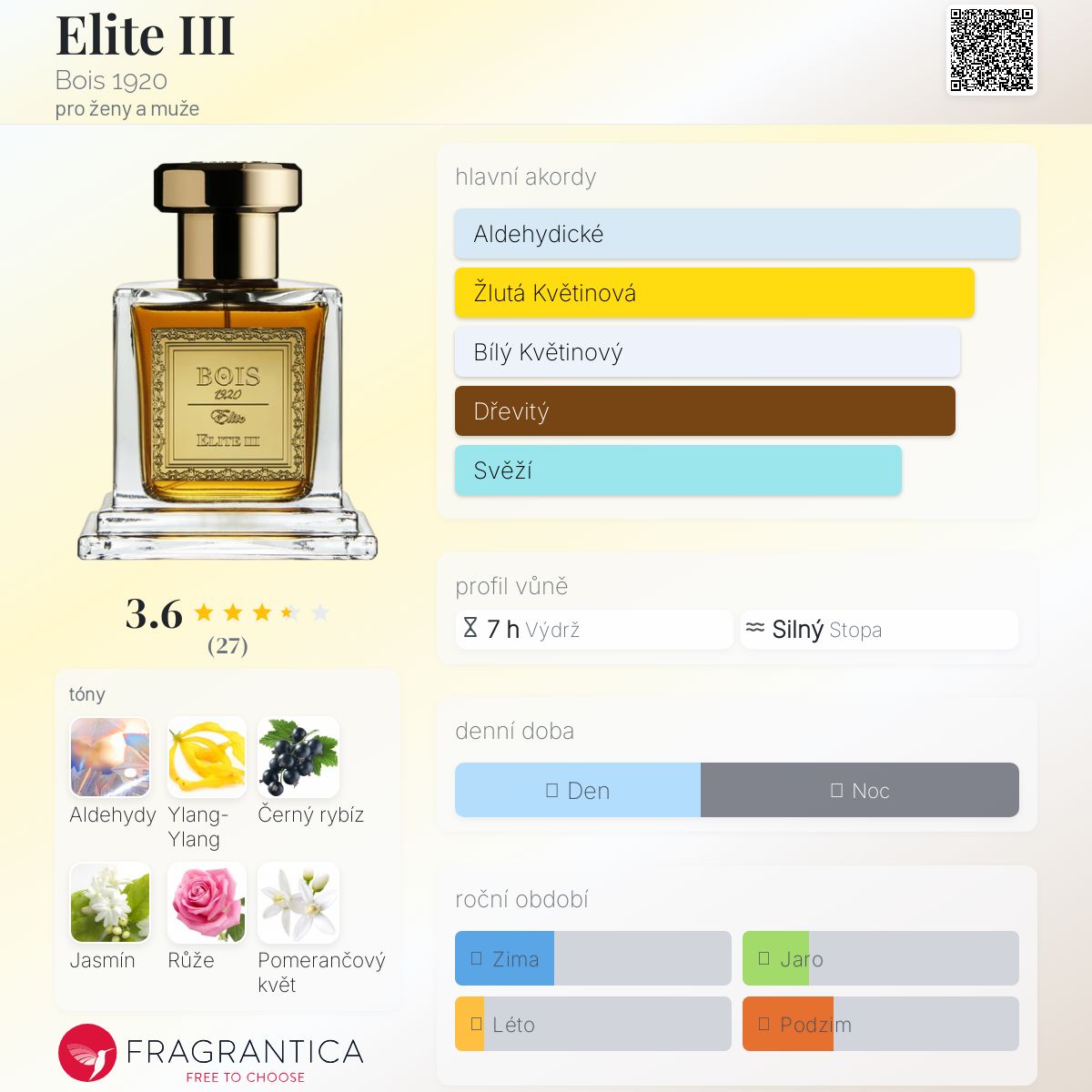 Elite III podle Bois 1920 je Chypre vůně pro ženy a muže. Elite III byl/a uveden/a v roce 2019. Vrchní tóny jsou Aldehydy a Černý rybíz; střední tóny jsouYlang-Ylang, Jasmín, Růže a Pomerančový květ ; základní tóny jsou Santalové dřevo, Pačuli a Kadidlo.
