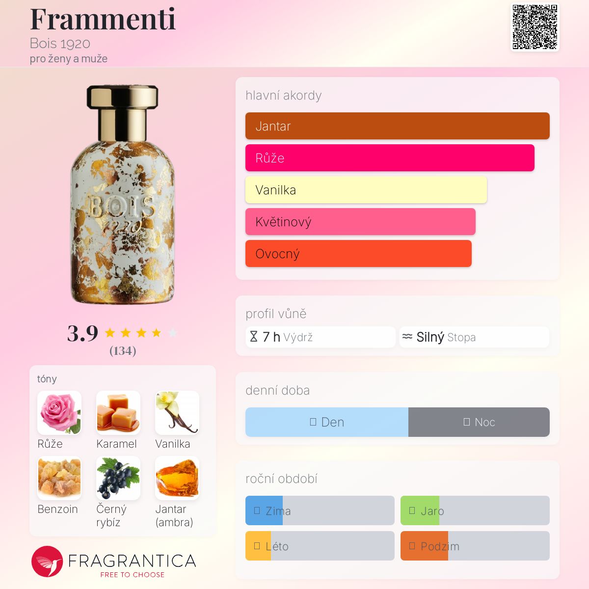 Frammenti podle Bois 1920 je vůně pro ženy a muže. Frammenti byl/a uveden/a v roce 2023. Vrchní tóny jsou Černý rybíz, Rebarbora, Zelené tóny, Grapefruit a Bergamot; střední tóny jsouRůže, Fialka, Kadidlo, Pelargónie a Magnólie ; základní tóny jsou Karamel, Vanilka, Benzoin, Jantar (ambra) a Bílé pižmo.
