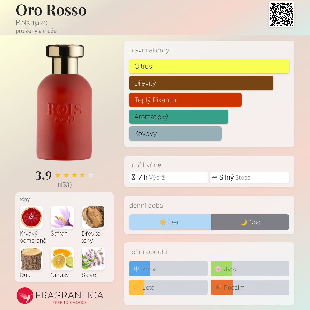 Oro Rosso podle Bois 1920 je Floral Fruity Gourmand vůně pro ženy a muže. Oro Rosso byl/a uveden/a v roce 2019. Vrchní tóny jsou Krvavý pomeranč a Citrusy; střední tóny jsouŠafrán, Šalvěj, Jasmín a Levandule ; základní tóny jsou Dřevité tóny, Dub a Pižmo.