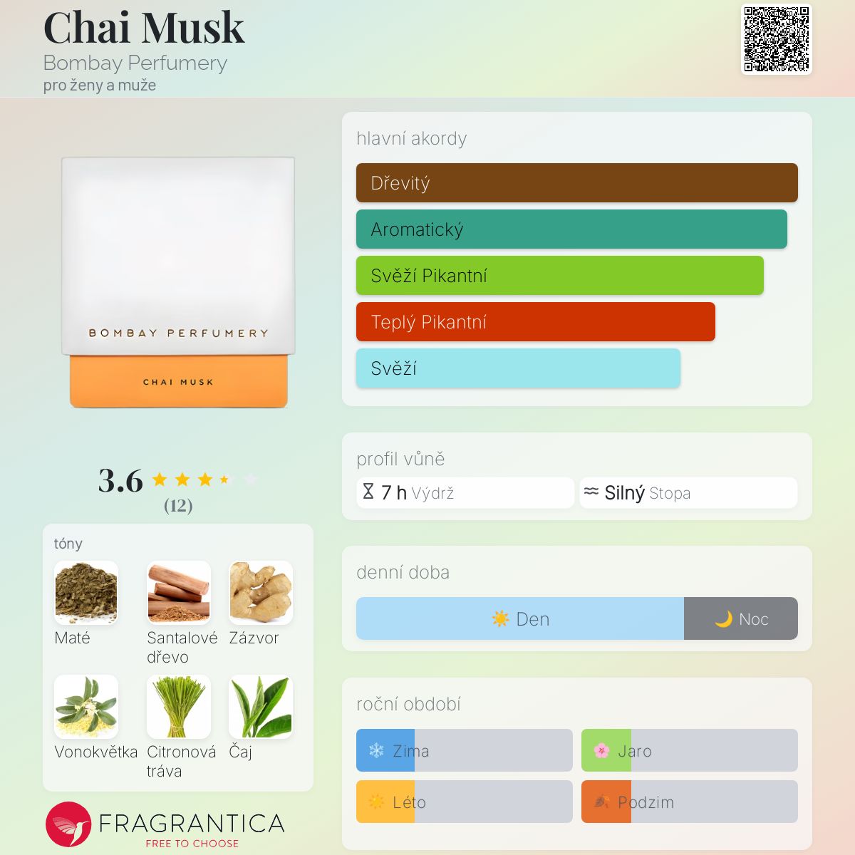 Chai Musk podle Bombay Perfumery je Citrus Aromatic vůně pro ženy a muže. Chai Musk byl/a uveden/a v roce 2016. Vrchní tóny jsou Zázvor, Citronová tráva a Zelený čaj; střední tóny jsouMaté, Vonokvětka a Lískový oříšek ; základní tóny jsou Santalové dřevo, Mléko a Jalovec.
