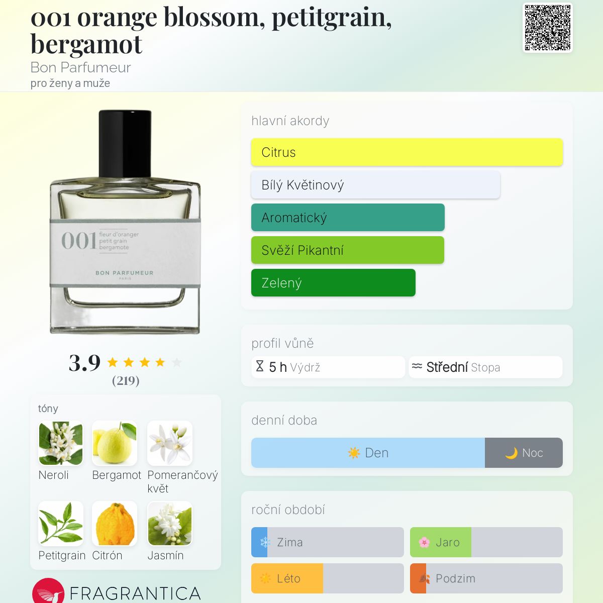 001 orange blossom, petitgrain, bergamot podle Bon Parfumeur je Citrus Aromatic vůně pro ženy a muže. 001 orange blossom, petitgrain, bergamot byl/a uveden/a v roce 2017. "Nosem" za touto vůní je Nathalie Koobus. Vrchní tóny jsou Bergamot, Citrón, Mandarinka a Rozmarýn; střední tóny jsouNeroli, Petitgrain, Jasmín a Levandule ; základní tóny jsou Pomerančový květ a Pižmo.
