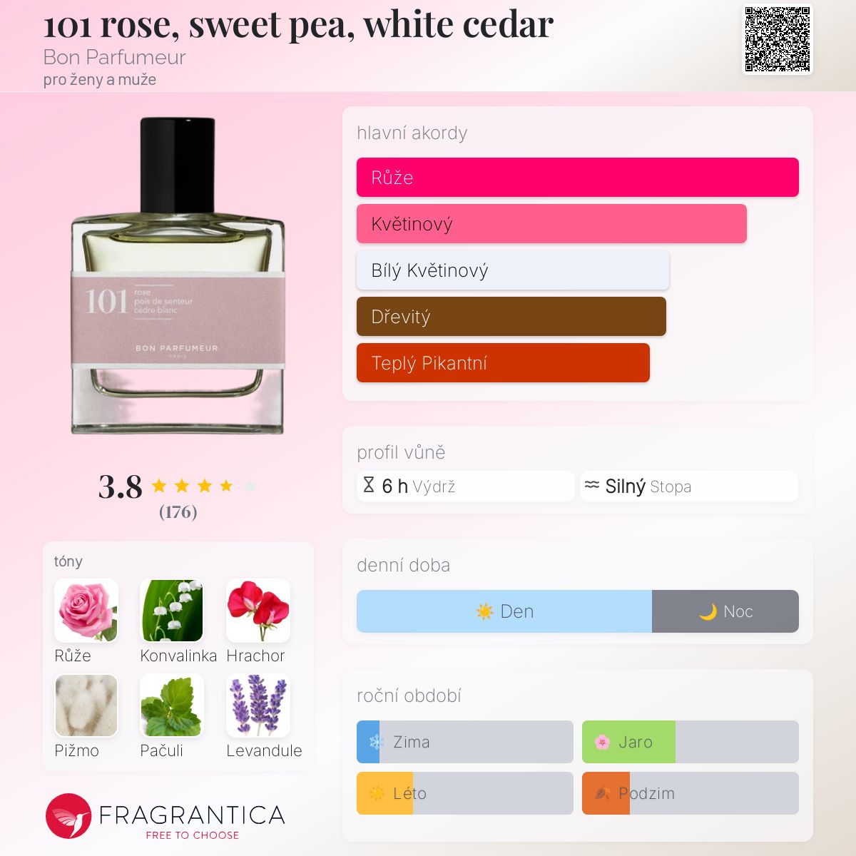 101 rose, sweet pea, white cedar podle Bon Parfumeur je Floral vůně pro ženy a muže. 101 rose, sweet pea, white cedar byl/a uveden/a v roce 2017. "Nosem" za touto vůní je Alexandra Monet. Vrchní tóny jsou Levandule, Bergamot a Kardamom; střední tóny jsouTurecká růže, Konvalinka, Hrachor a Extrakt z bílého cedru ; základní tóny jsou Pižmo, Pačuli a Křišťálový jantar.