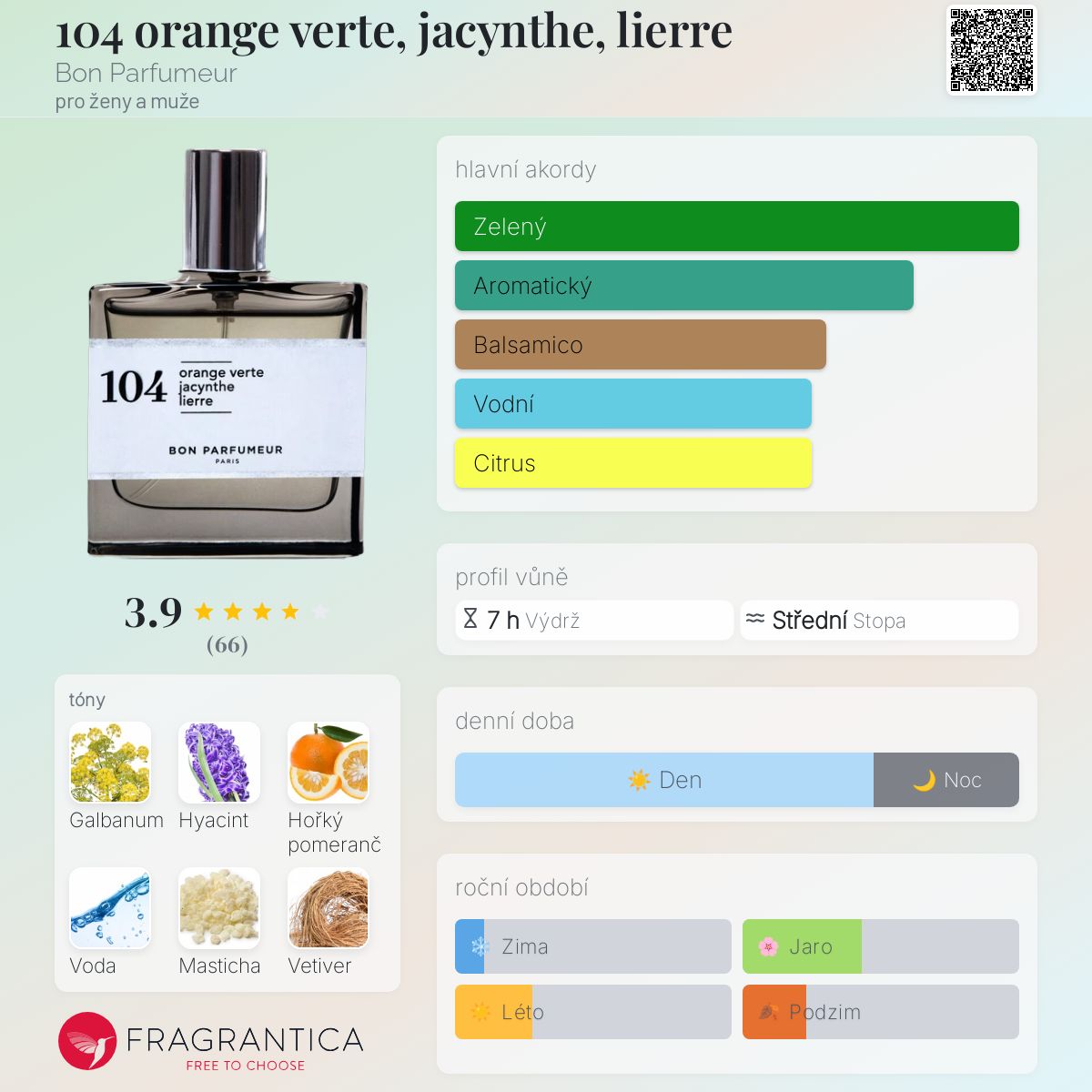 104 orange verte, jacynthe, lierre podle Bon Parfumeur je Aromatic Aquatic vůně pro ženy a muže. 104 orange verte, jacynthe, lierre byl/a uveden/a v roce 2019. "Nosem" za touto vůní je Corinne Cachen. Vrchní tóny jsou Galbanum, Hořký pomeranč, Masticha a Kardamom; střední tóny jsouHyacint, Vodnaté tóny a Jasmín ; základní tóny jsou Vetiver, Pačuli a Jantar (ambra).