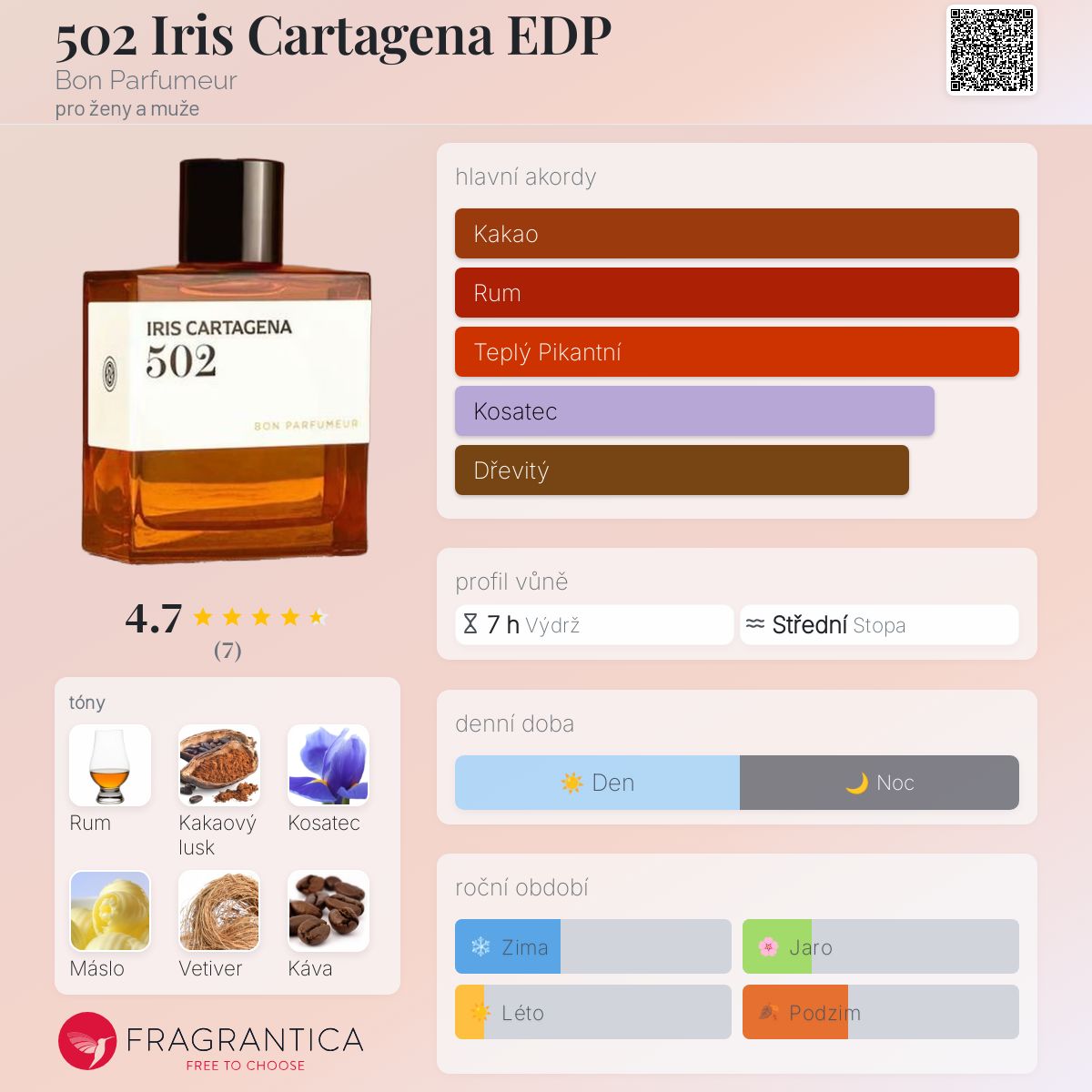 502 Iris Cartagena EDP podle Bon Parfumeur je Orientální Vanilla vůně pro ženy a muže. Toto je nová vůně. 502 Iris Cartagena EDP byl/a uveden/a v roce 2025. "Nosem" za touto vůní je Clément Marx. Vrchní tóny jsou Kakao, Rum, Mandarinka, Mandarinka a Petitgrain; střední tóny jsouKosatec, Santalové dřevo, Eukalyptus a Vanilka ; základní tóny jsou Kakao, Káva, Papyrus, Máslo a Vetiver.