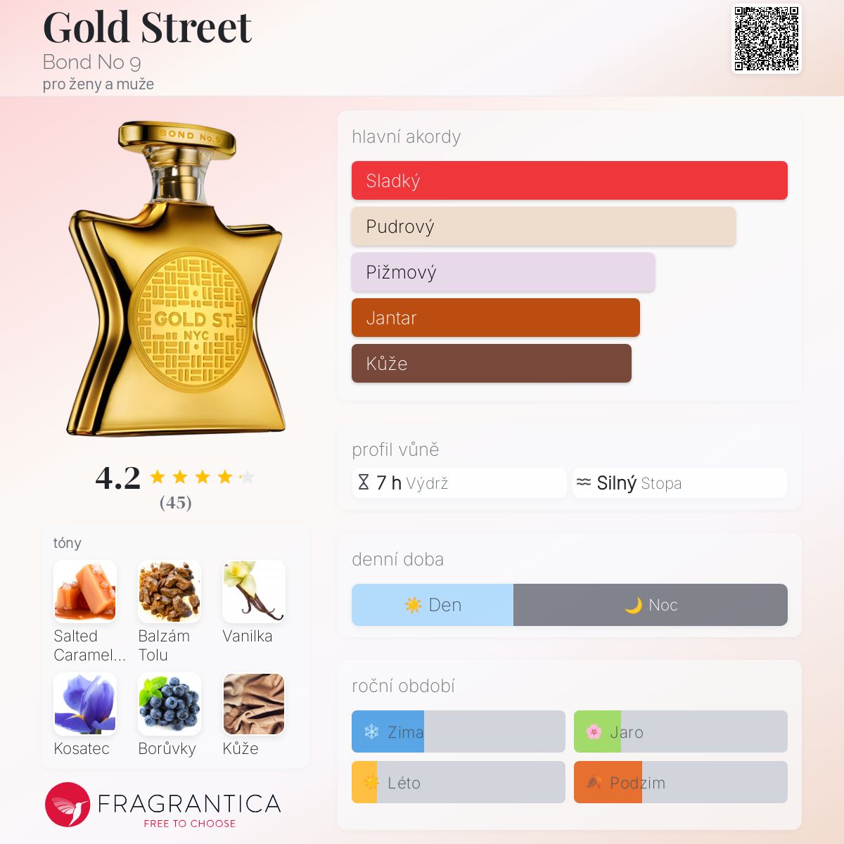 Gold Street podle Bond No 9 je Leather vůně pro ženy a muže. Toto je nová vůně. Gold Street byl/a uveden/a v roce 2024. "Nosem" za touto vůní je Vincent Schaller. Vrchní tóny jsou Borůvky, Kůže, Jasmín a Růžový pepř; střední tóny jsouSlaný karamelový fondán, Kosatec, Semiš a Ambrette (přírodní pižmo) ; základní tóny jsou Balzám Tolu, Vanilka, Pižmo a Dubový mech.