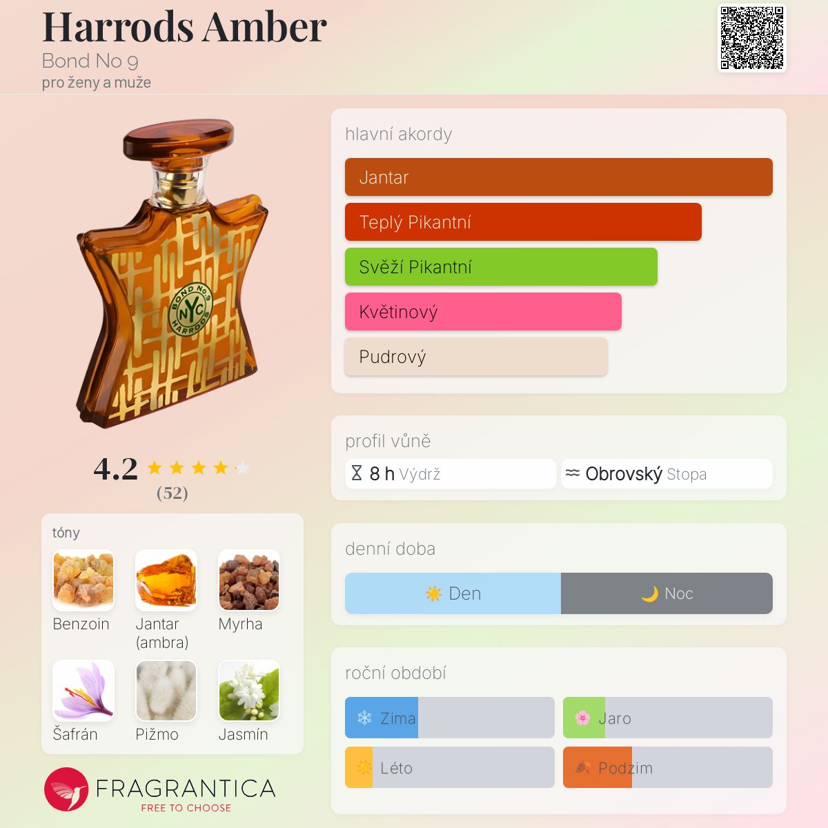 Harrods Amber podle Bond No 9 je Orientální Spicy vůně pro ženy a muže. Harrods Amber byl/a uveden/a v roce 2011. Vrchní tóny jsou Šafrán, Muškátový oříšek, Bergamot a Pepř; střední tóny jsouJasmín, Vonokvětka a Růže ; základní tóny jsou Benzoin, Jantar (ambra), Myrha, Pižmo, Santalové dřevo a Agarové dřevo (oud).