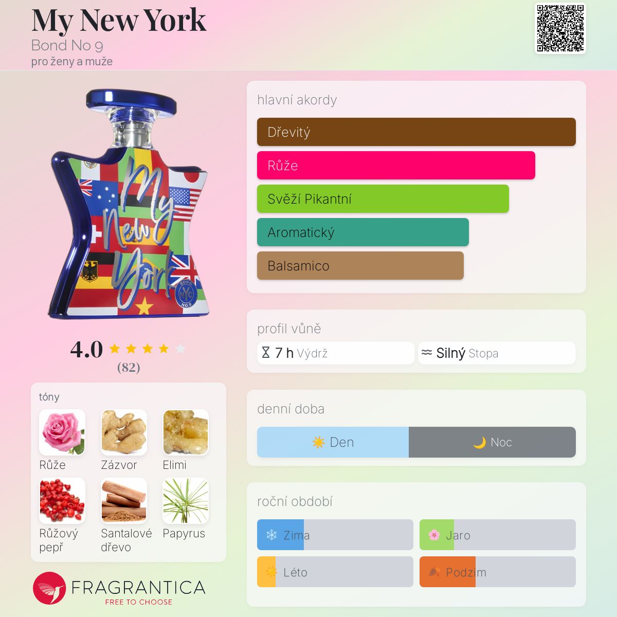 My New York podle Bond No 9 je Orientální Floral vůně pro ženy a muže. My New York byl/a uveden/a v roce 2020. "Nosem" za touto vůní je Michel Almairac. Vrchní tóny jsou Zázvor, Elemi a Růžový pepř; střední tóny jsouRůže a Papyrus ; základní tóny jsou Santalové dřevo, Pačuli a Kašmír.