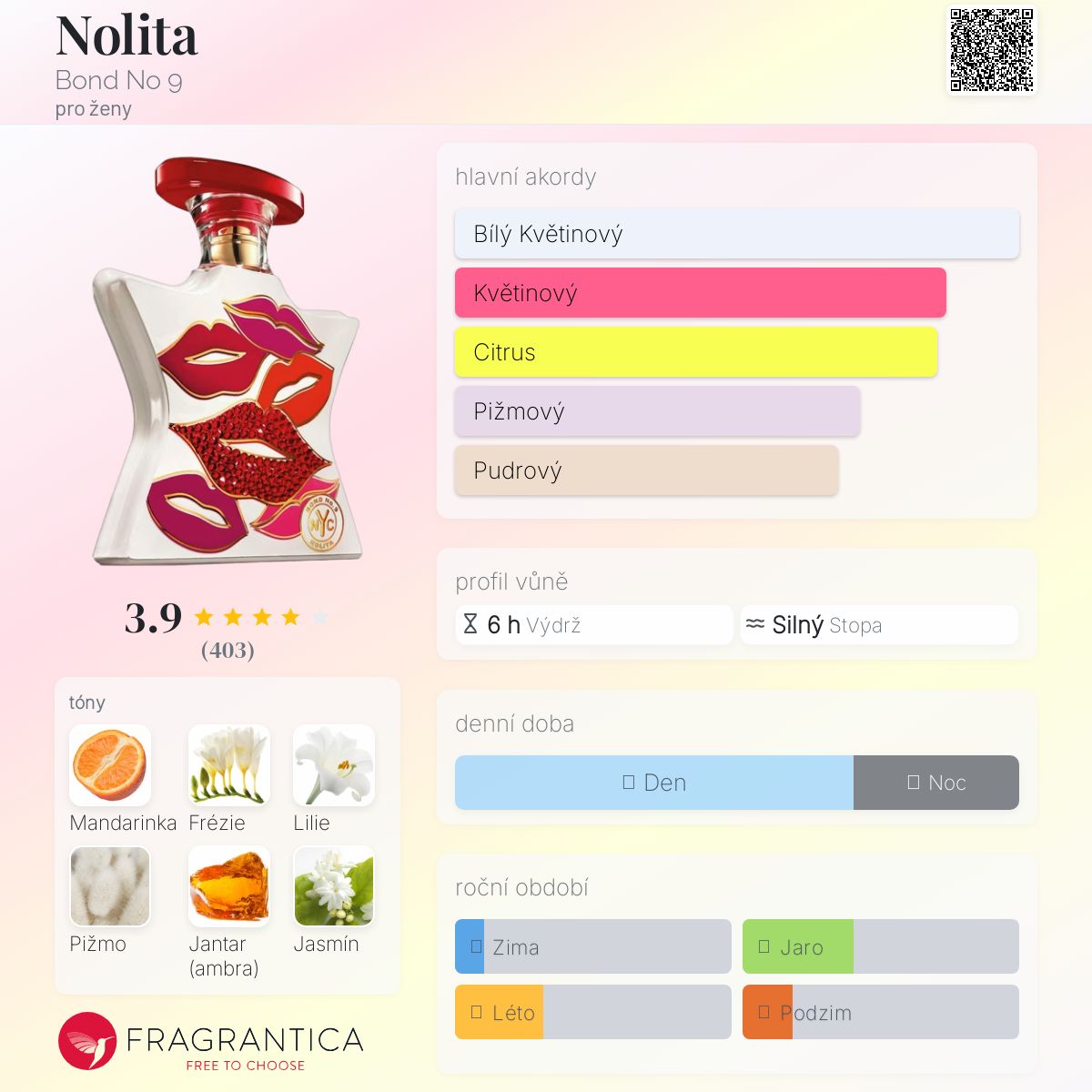 Nolita podle Bond No 9 je Floral Woody Musk vůně pro ženy. Nolita byl/a uveden/a v roce 2017. Vrchní tóny jsou Mandarinka a Frézie; střední tóny jsouLilie, Jasmín Sambac a Růže ; základní tóny jsou Pižmo, Jantar (ambra) a Santalové dřevo.