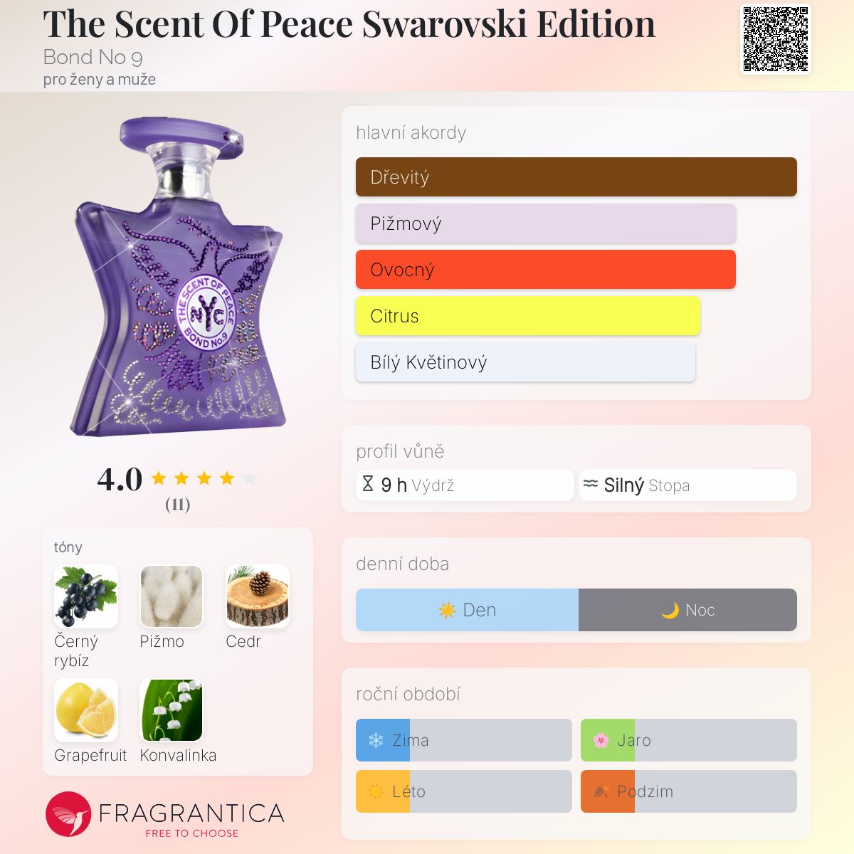 The Scent Of Peace Swarovski Edition podle Bond No 9 je Floral Woody Musk vůně pro ženy a muže. The Scent Of Peace Swarovski Edition byl/a uveden/a v roce 2015. Vrchní tóny jsou Černý rybíz a Grapefruit; střední tón jeKonvalinka ; základní tóny jsou Pižmo a Cedr.