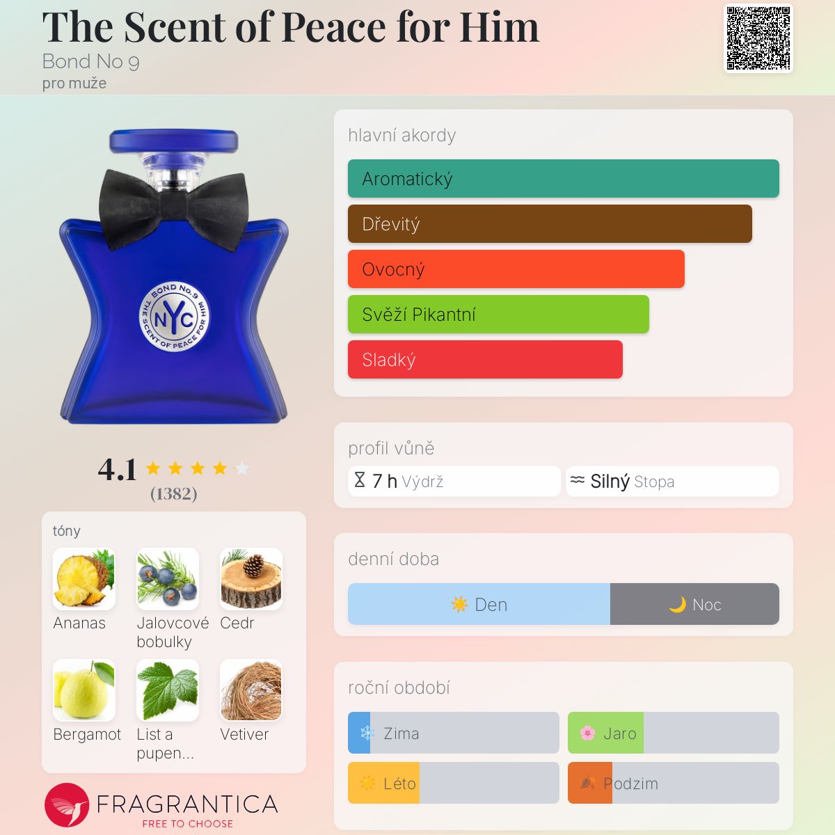 The Scent of Peace for Him podle Bond No 9 je Woody Aromatic vůně pro muže. The Scent of Peace for Him byl/a uveden/a v roce 2013. Vrchní tóny jsou Ananas, Jalovcové bobulky a Bergamot; střední tón jePoupata rybízu ; základní tóny jsou Cedr a Vetiver.