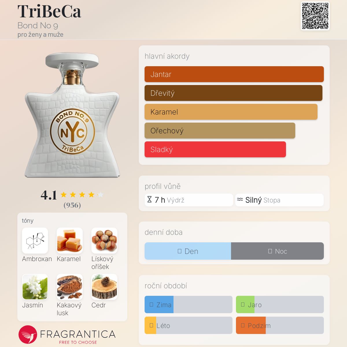 TriBeCa podle Bond No 9 je Orientální Vanilla vůně pro ženy a muže. TriBeCa byl/a uveden/a v roce 2020. "Nosem" za touto vůní je Michel Almairac. Vrchní tóny jsou Lískový oříšek a Kakao; střední tóny jsouJasmín Sambac a Cedr ; základní tóny jsou Ambroxan, Karamel a Mech.