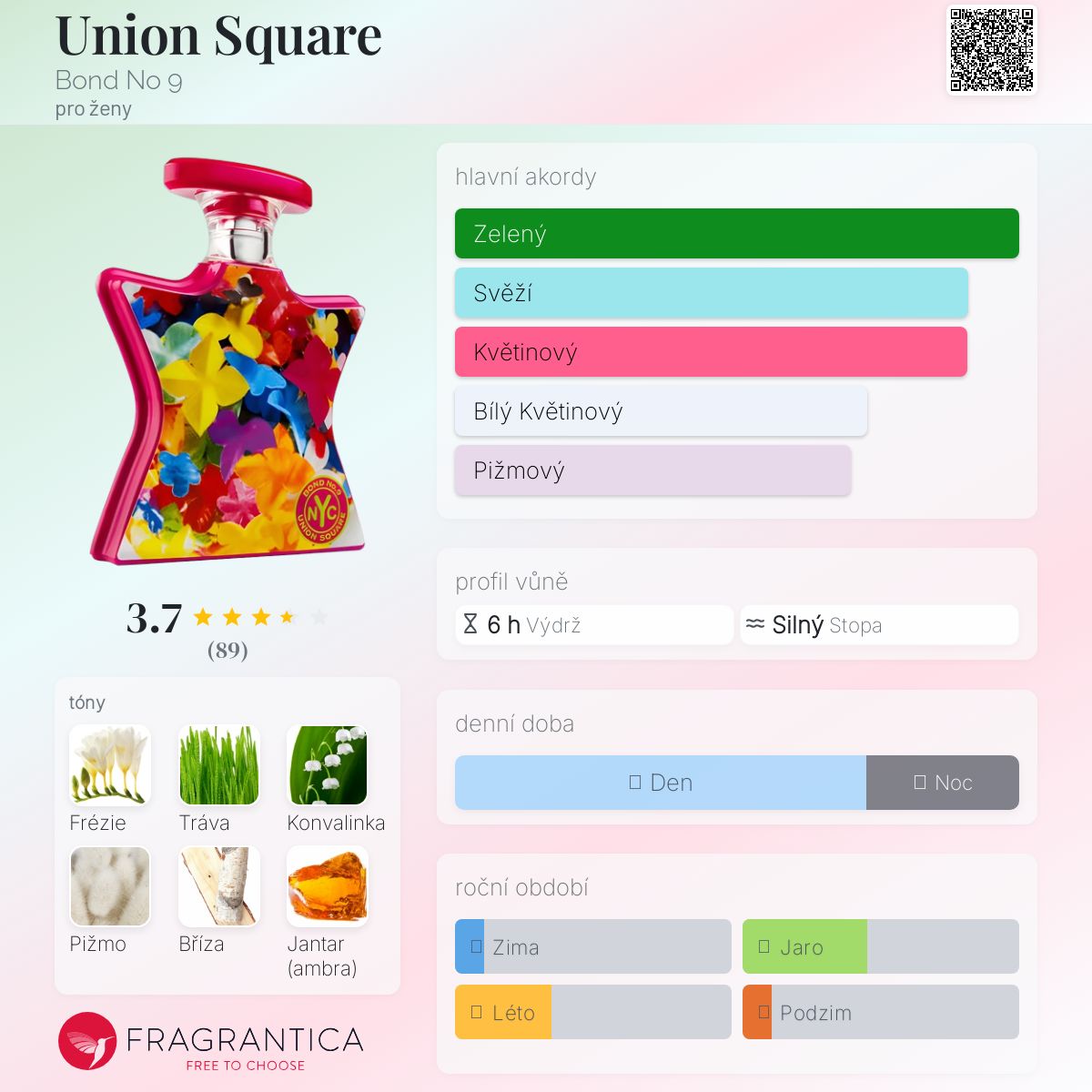 Union Square podle Bond No 9 je Floral Green vůně pro ženy. Union Square byl/a uveden/a v roce 2013. "Nosem" za touto vůní je Stephen Nilsen. Vrchní tóny jsou Tráva a Konvalinka; střední tóny jsouFrézie a Bříza ; základní tóny jsou Pižmo a Jantar (ambra).