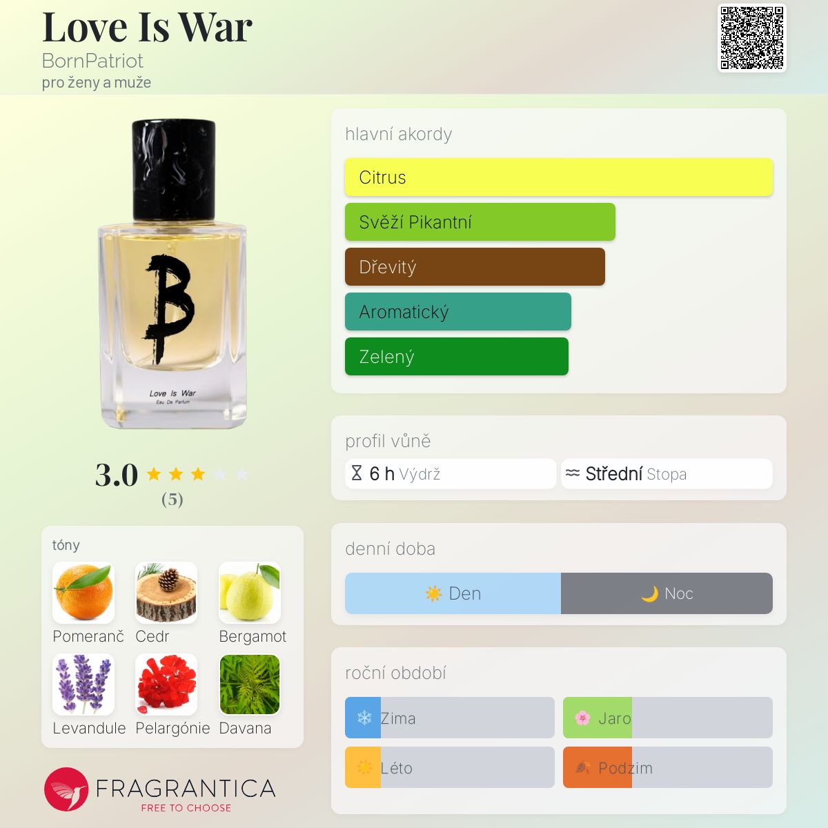 Love Is War podle BornPatriot je Orientální Spicy vůně pro ženy a muže. Toto je nová vůně. Love Is War byl/a uveden/a v roce 2025. "Nosem" za touto vůní je Matthieu Meneuvrier. Vrchní tóny jsou Pomeranč, Bergamot, Šafrán, Elimi a Rum; střední tóny jsouLevandule, Pelargónie, Davana, Cocktail accord a Jalovec ; základní tóny jsou Cedr, Jantar (ambra), Pačuli, Karamel a Fazole tonka.