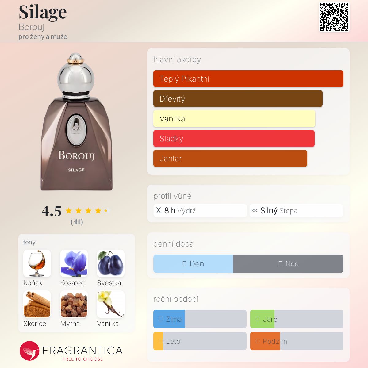 Silage podle Borouj je Aromatic Spicy vůně pro ženy a muže. Silage byl/a uveden/a v roce 2020. Vrchní tóny jsou Koňak, Švestka a Skořice; střední tóny jsouKosatec a Myrha ; základní tóny jsou Vanilka, Fazole tonka a Santalové dřevo.