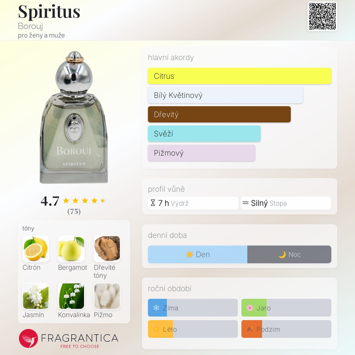 Spiritus podle Borouj je Orientální vůně pro ženy a muže. Spiritus byl/a uveden/a v roce 2020. Vrchní tóny jsou Citrón a Bergamot; střední tóny jsouDřevité tóny, Jasmín a Konvalinka ; základní tóny jsou Pižmo, Pačuli a Jantar (ambra).