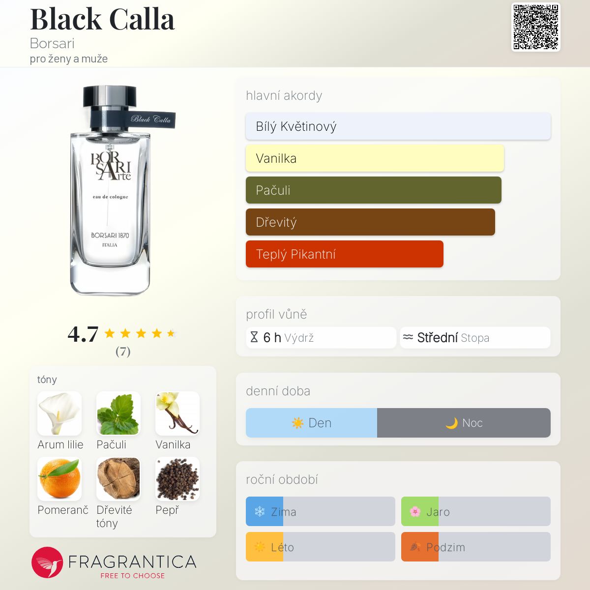 Black Calla podle Borsari je Orientální Floral vůně pro ženy a muže. Black Calla byl/a uveden/a v roce 2010. Vrchní tóny jsou Pomeranč, Pepř a Bergamot; střední tóny jsouArum lilie, Pačuli, Jasmín a Levandule ; základní tóny jsou Vanilka, Dřevité tóny a Pižmo.