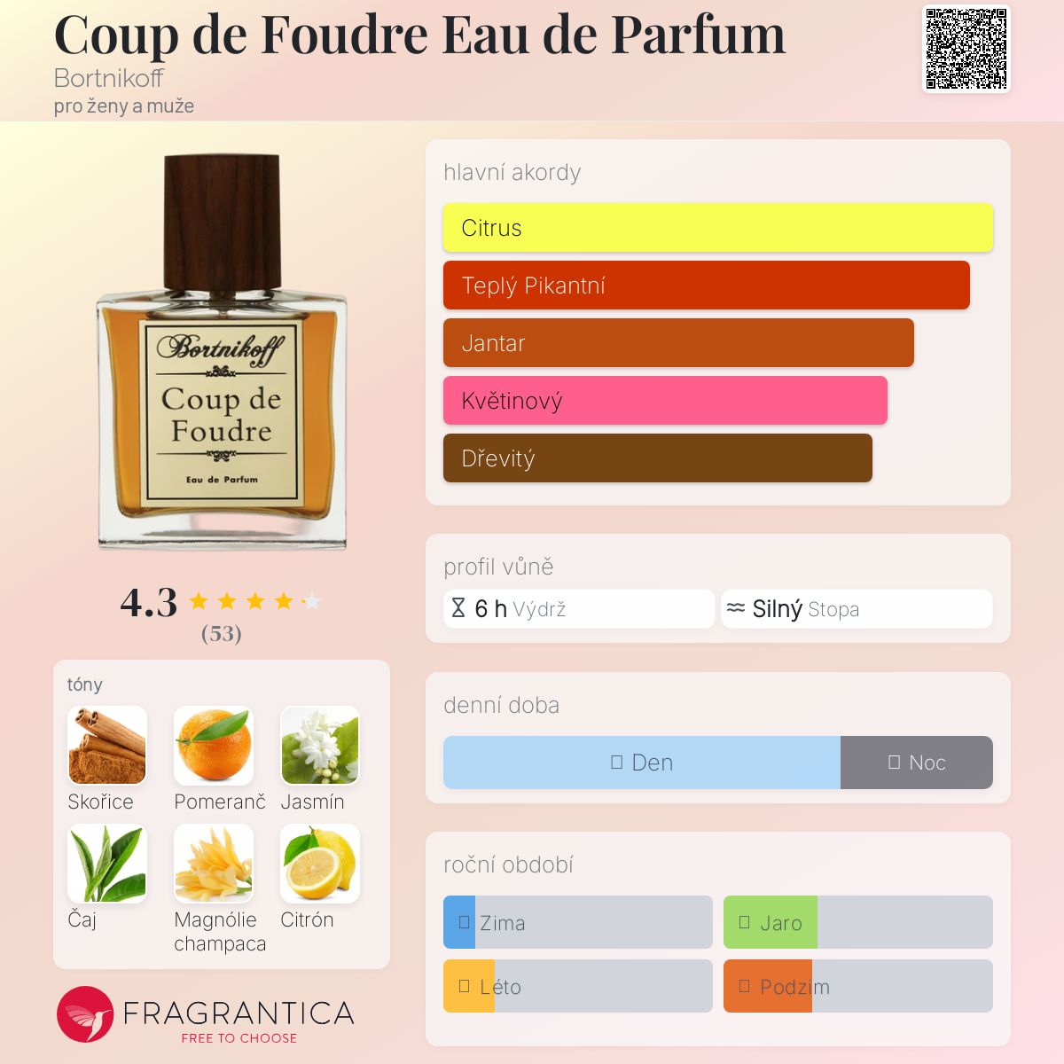 Coup de Foudre Eau de Parfum podle Bortnikoff je Citrus Gourmand vůně pro ženy a muže. Coup de Foudre Eau de Parfum byl/a uveden/a v roce 2020. "Nosem" za touto vůní je Dmitry Bortnikoff. Vrchní tóny jsou Sladký pomeranč, Zelený čaj, Citrón, Bergamot, Černý pepř a Bílý grapefruit; střední tóny jsouMagnólie champaca, Jasmín, Konvalinka, Růže de Mai, Ylang-Ylang a Tuberóza ; základní tóny jsou Skořice, Labdanum, Benzoin, Guajakové dřevo, Kurkuma, Růžový lotos, Agarové dřevo (oud), Vanilka, Balzám Tolu, Santalové dřevo, Borovice a Fazole tonka.