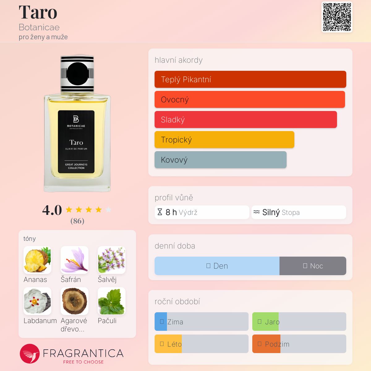Taro podle Botanicae je vůně pro ženy a muže. Vrchní tóny jsou Ananas a Šafrán; střední tóny jsouŠalvěj a Jasmín ; základní tóny jsou Labdanum, Agarové dřevo (oud) a Pačuli.