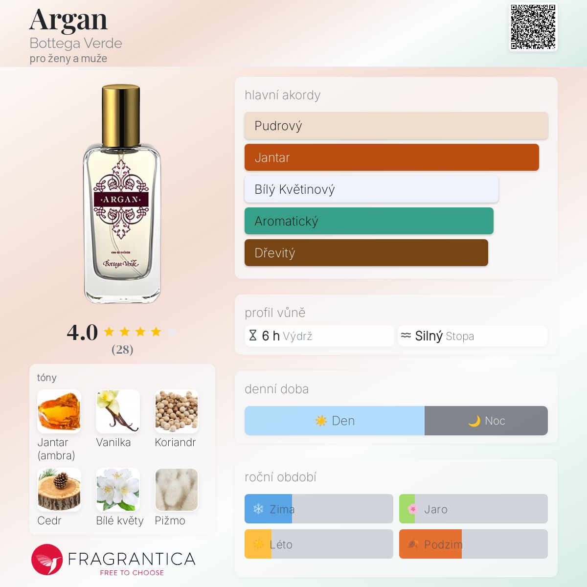 Argan podle Bottega Verde je Orientální vůně pro ženy a muže. Vrchní tóny jsou Koriandr, Citronová kůra a Bergamot; střední tóny jsouBílé květy, Kosatec a Konvalinka ; základní tóny jsou Jantar (ambra), Vanilka, Cedr a Pižmo.
