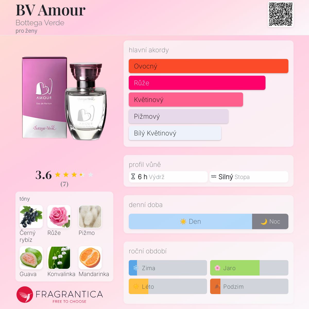 BV Amour podle Bottega Verde je Floral Fruity vůně pro ženy. BV Amour byla spuštěna během 2000. Vrchní tóny jsou Černý rybíz, Guava a Mandarinka; střední tóny jsouRůže, Konvalinka a Karafiát ; základní tóny jsou Pižmo, Fazole tonka a Vanilka.