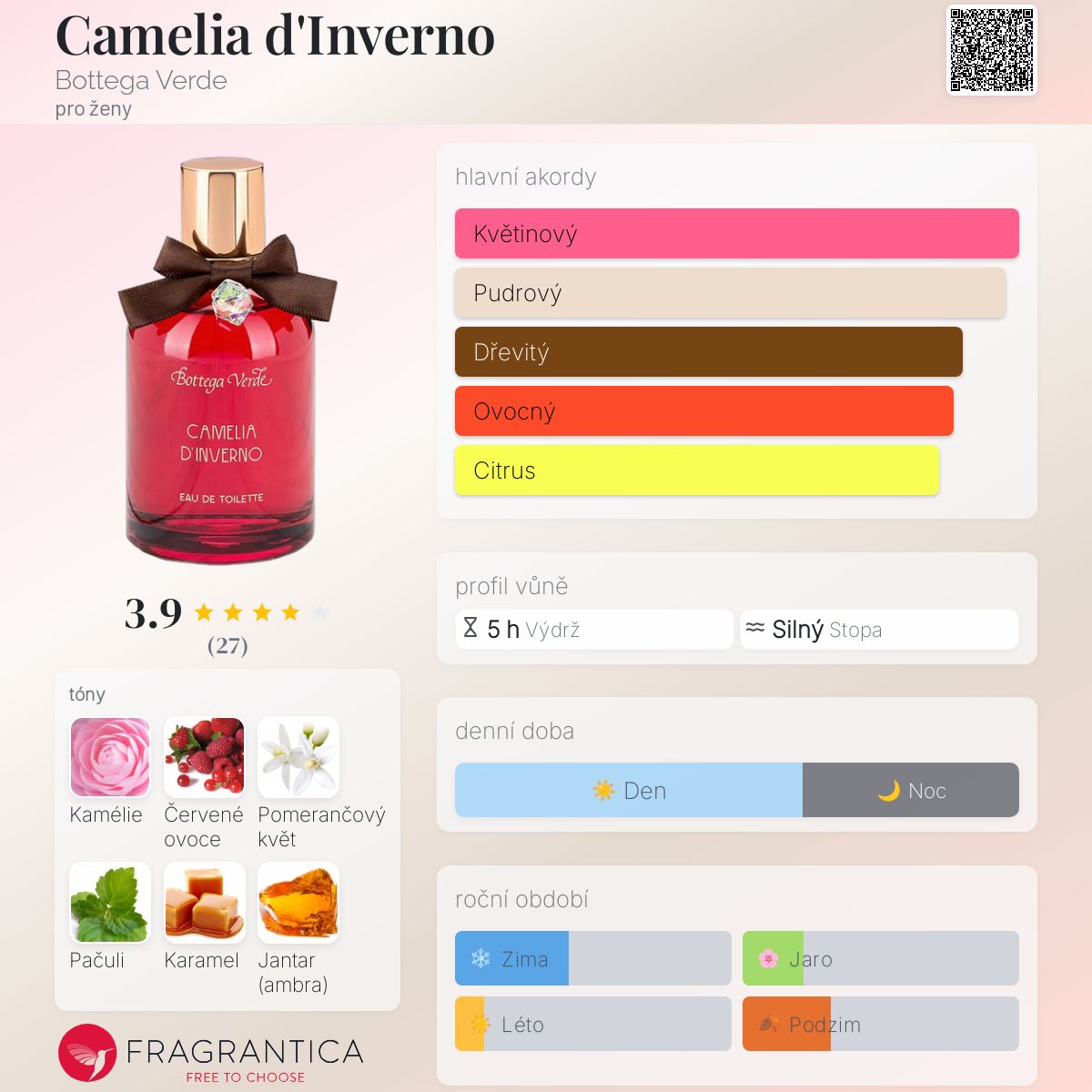Camelia d'Inverno podle Bottega Verde je Floral vůně pro ženy. Vrchní tóny jsou Červené ovoce, Citrón a Mandarinka; střední tóny jsouKamélie, Pomerančový květ a Karamel ; základní tóny jsou Pačuli, Jantar (ambra) a Santalové dřevo.