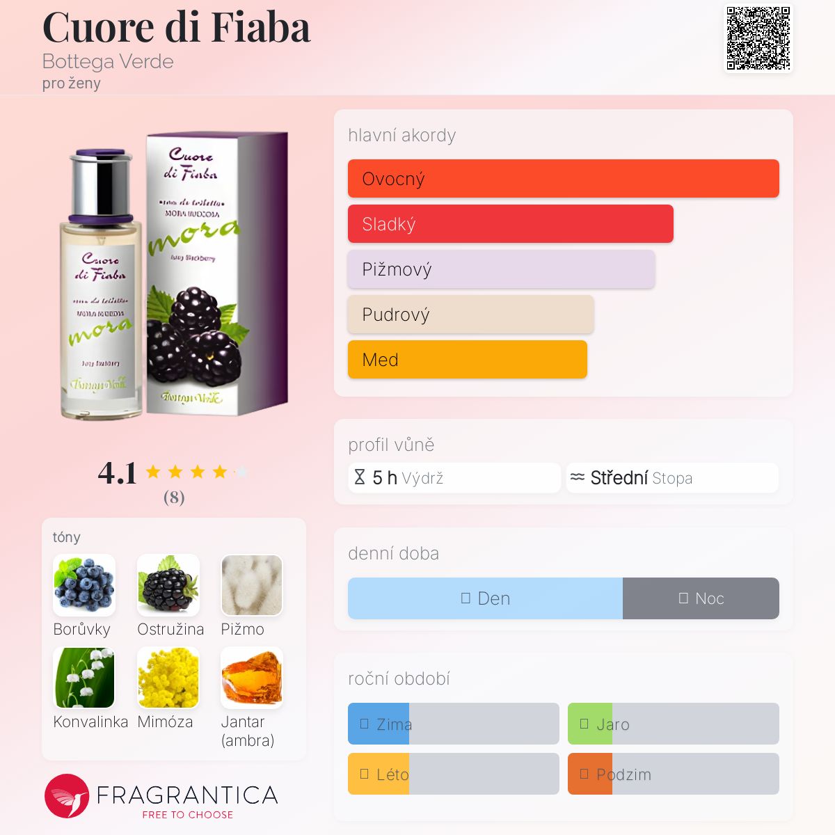Cuore di Fiaba podle Bottega Verde je Floral Fruity vůně pro ženy. Vrchní tóny jsou Borůvky a Ostružina; střední tóny jsouKonvalinka, Mimóza a Jasmín ; základní tóny jsou Bílé pižmo, Jantar (ambra) a Ambrette (přírodní pižmo).