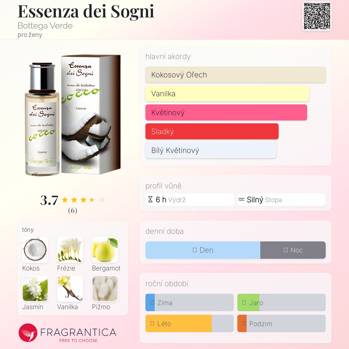 Essenza dei Sogni podle Bottega Verde je Floral Fruity vůně pro ženy. Essenza dei Sogni byla spuštěna během 2000. Vrchní tóny jsou Frézie a Bergamot; střední tóny jsouKokos a Jasmín ; základní tóny jsou Vanilka a Bílé pižmo.