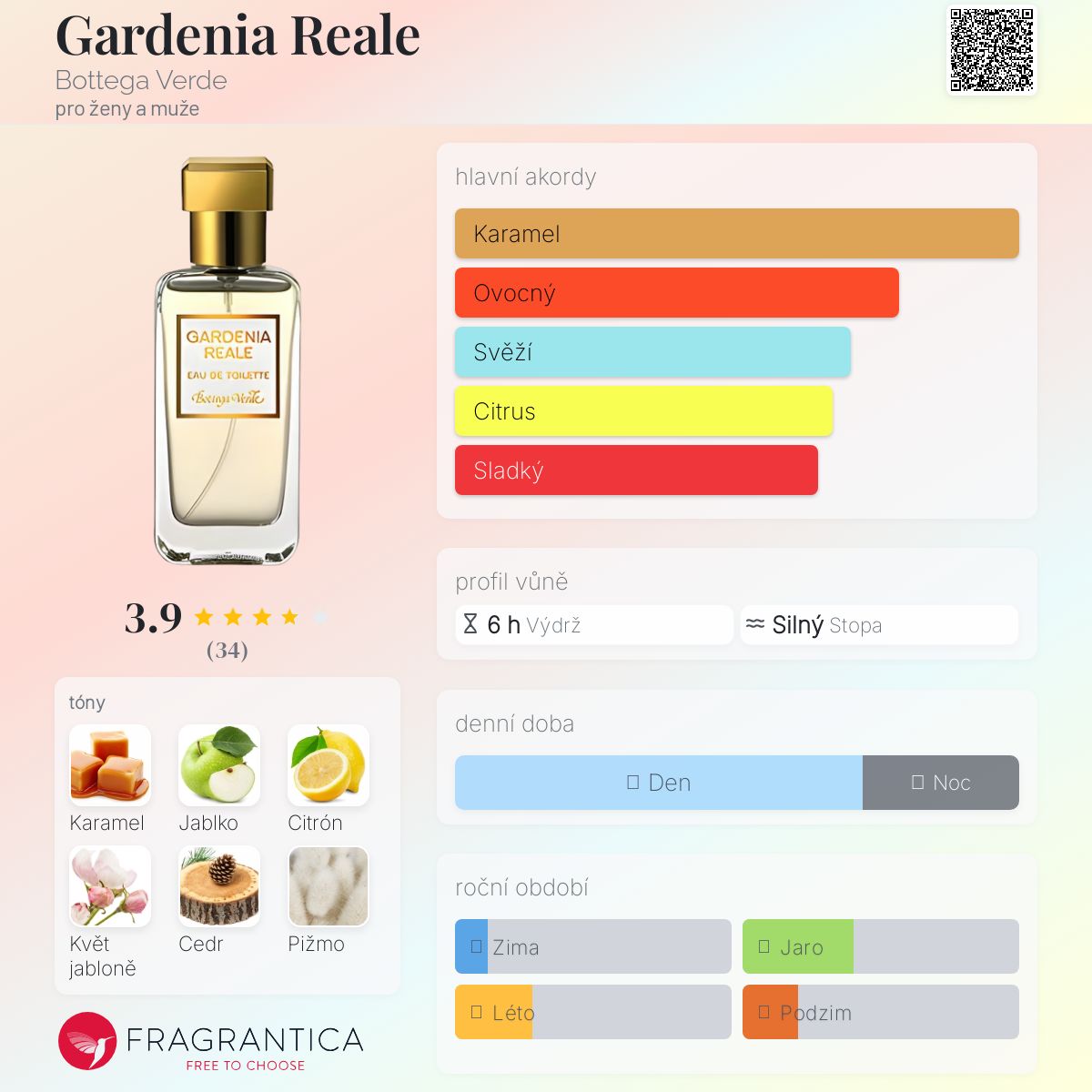 Gardenia Reale podle Bottega Verde je Floral vůně pro ženy a muže. Vrchní tóny jsou Jablko, Citrón a Květ jabloně; střední tóny jsouKaramel a Kosatec ; základní tóny jsou Cedr a Pižmo.