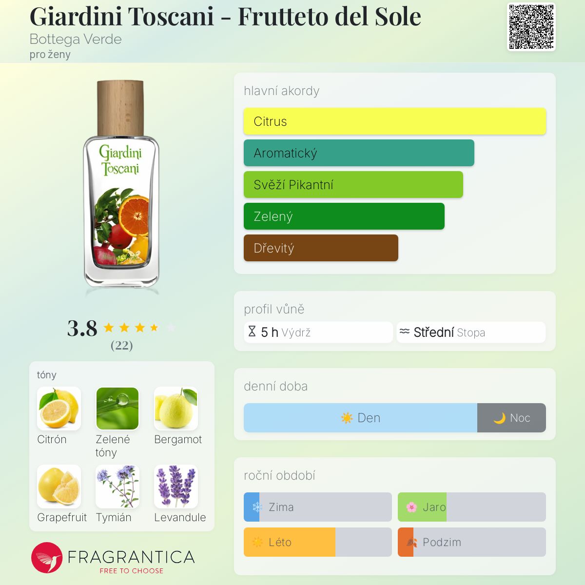 Giardini Toscani - Frutteto del Sole podle Bottega Verde je Citrus Aromatic vůně pro ženy. Vrchní tóny jsou Citrón, Zelené tóny, Bergamot a Grapefruit; střední tóny jsouLevandule, Muškátový oříšek a Růže ; základní tóny jsou Tymián, Cedr a Bílé pižmo.