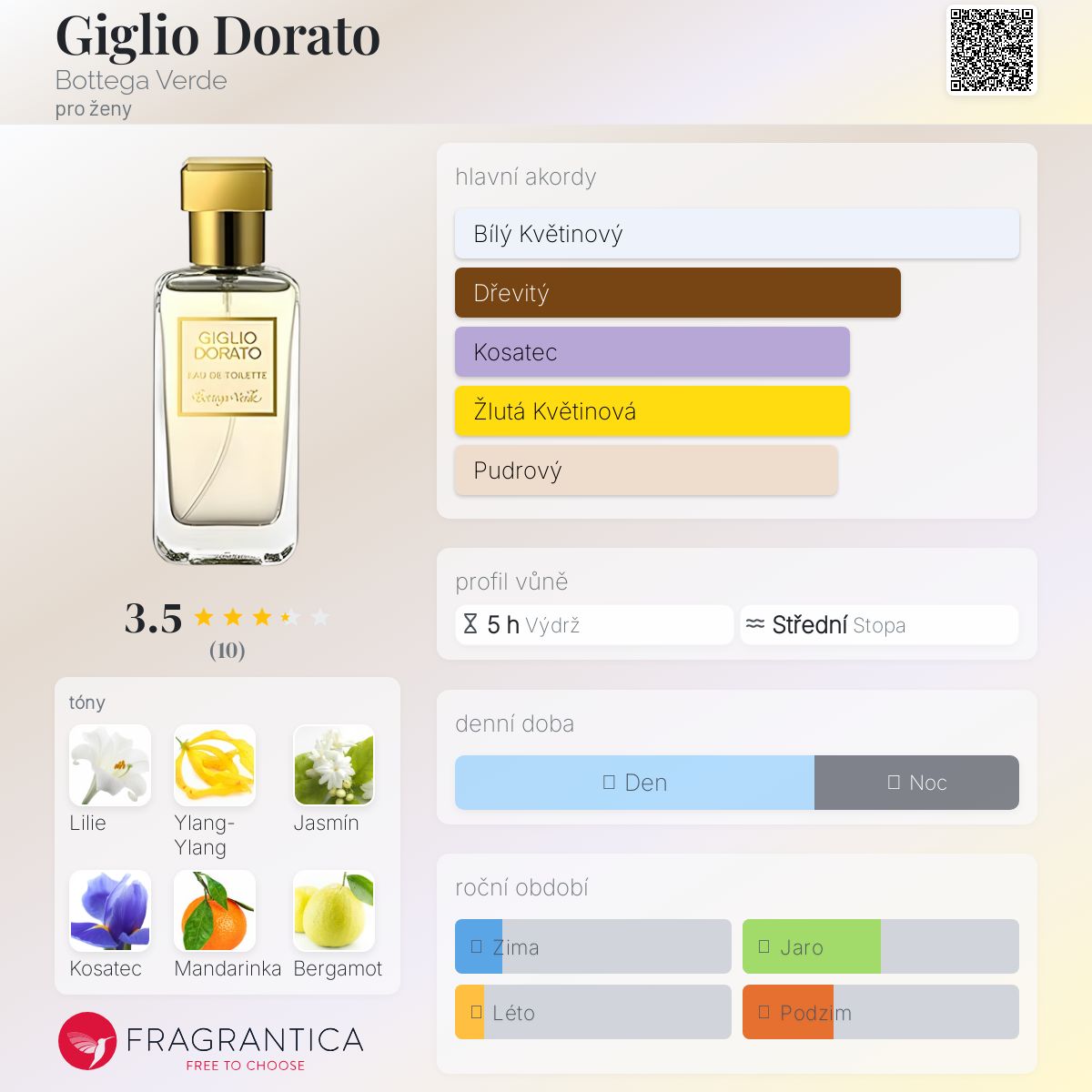 Giglio Dorato podle Bottega Verde je vůně pro ženy. Giglio Dorato byl/a uveden/a v roce 2015. Vrchní tóny jsou Mandarinka a Bergamot; střední tóny jsouLilie, Ylang-Ylang, Jasmín, Kosatec a Broskev ; základní tóny jsou Vetiver, Santalové dřevo, Cedr a Vanilka.