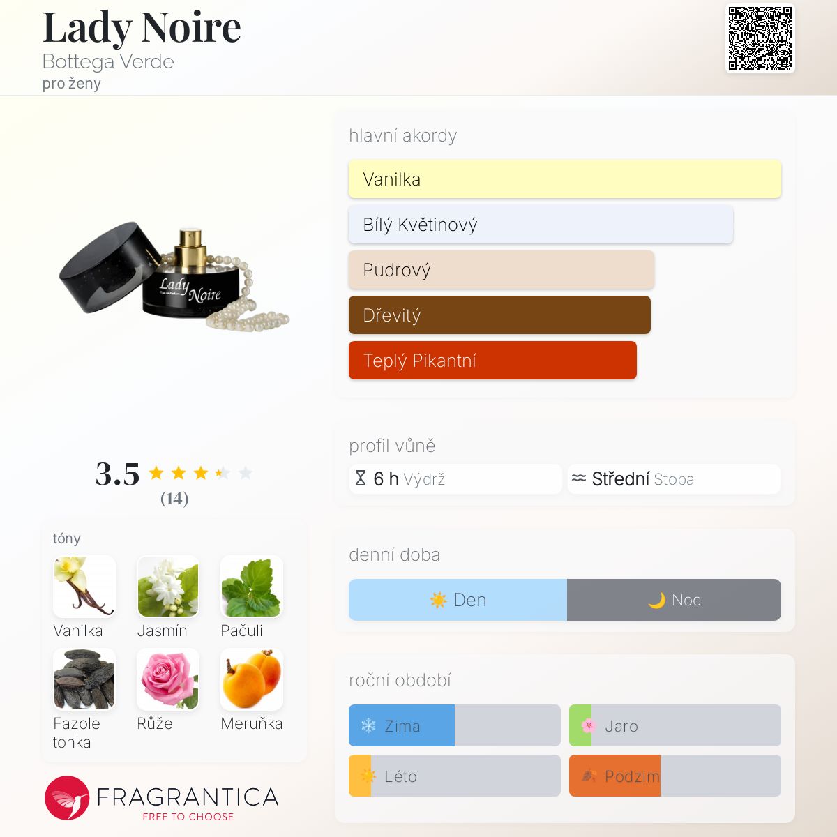 Lady Noire podle Bottega Verde je Orientální Floral vůně pro ženy. Lady Noire byla spuštěna během 2000. Vrchní tóny jsou Bílý pepř, Kalábrijský bergamot a Mandarinka; střední tóny jsouDivoký jasmín, Turecká růže, Meruňka a Konvalinka ; základní tóny jsou Vanilka, Pačuli, Fazole tonka, Bílé pižmo a Australské santalové dřevo.