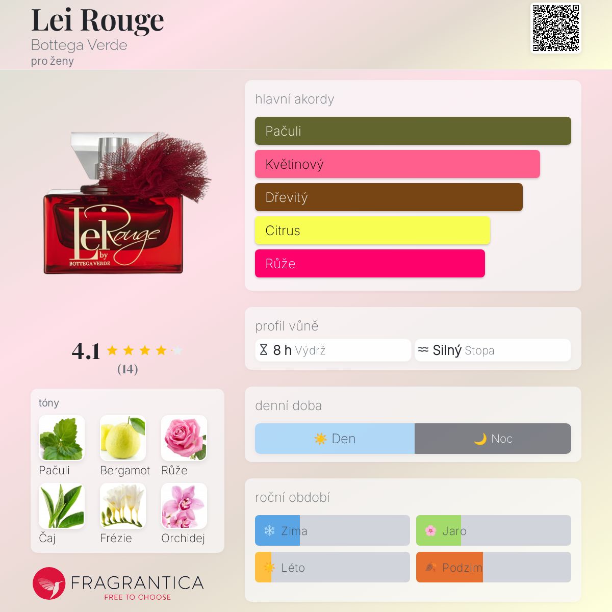 Lei Rouge podle Bottega Verde je Floral Woody Musk vůně pro ženy. Vrchní tóny jsou Bergamot, Růže a Bílý čaj; střední tóny jsouFrézie, Orchidej a Jasmín Sambac ; základní tóny jsou Pačuli, Pižmo a Santalové dřevo.