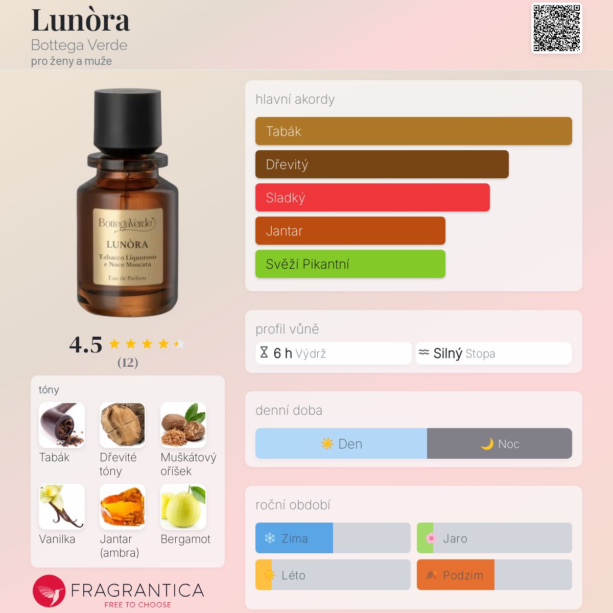 Lunòra podle Bottega Verde je vůně pro ženy a muže. Lunòra byl/a uveden/a v roce 2025. Vrchní tóny jsou Muškátový oříšek a Bergamot; střední tóny jsouTabák a Vanilka ; základní tóny jsou Dřevité tóny, Jantar (ambra) a Likér.
