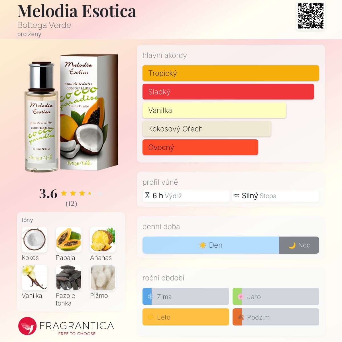 Melodia Esotica podle Bottega Verde je Floral Fruity Gourmand vůně pro ženy. Melodia Esotica byla spuštěna během 2000. Vrchní tóny jsou Kokos a Mangostan; střední tóny jsouPapája a Ananas ; základní tóny jsou Vanilka, Fazole tonka a Bílé pižmo.